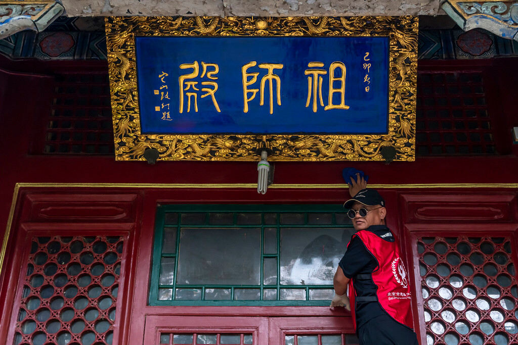 伽蓝殿对面是祖师殿,有志愿者正在擦拭殿前额匾。