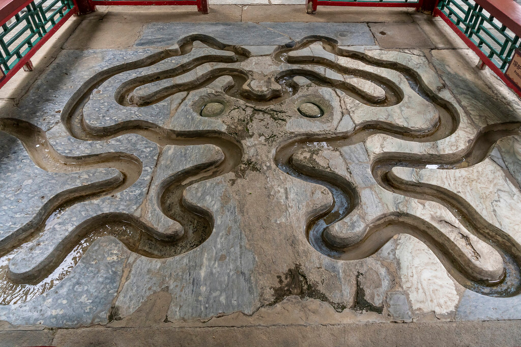 “此地有崇山峻岭,茂林修竹,又有清流激湍,映带左右,引以为流觞曲水,列坐其次”。怎么样?你肯定会想到王羲之的《兰亭集序》吧?乾隆把这么好的一块石头凿出沟槽当然是为了做曲水供流觞,乾隆和方丈二人相对而坐,有太监和小和尚在那曲水上摆放酒盅,帝僧二人便取身边酒饮之。乾隆喝的肯定是绍兴陈酿老雕,方丈要挑流觞中的可口可乐饮。乾隆身边有宫女举着一盘醉虾,方丈身边也有小和尚捧着一碗毛豆。乾隆在这里搭这么一座亭子,就是为了胁迫老僧附庸风雅。潭柘寺这里不缺“崇山峻岭”,既如此,那还要有“茂林修竹”,还真有。