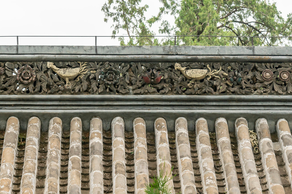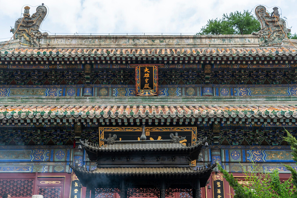 毗卢阁的正脊上有很多砖雕,非同凡响。北方殿堂这样的砖雕屋脊十分稀有。