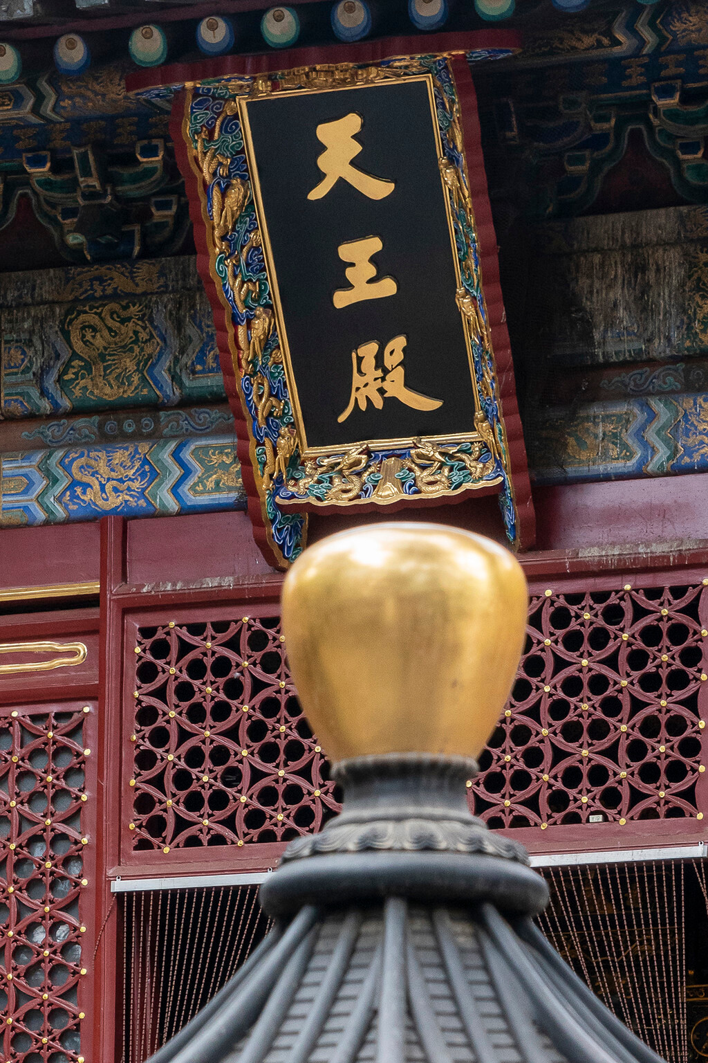 天王殿前的香炉是香客们用的,香炉两边的香亭是僧人自用的。天王殿面阔三间,明间开门,梢间槛墙槛窗,门窗都是隔扇,皇家专用的三交六椀棂花。既然是敕建之寺,他用此三交六椀棂花便没人去宫里举报。上面是斗拱抬梁结构,绿色琉璃瓦单檐歇山顶。额枋下挂“天王殿”贴金七龙斗匾,清康熙所题。但看这字迹不像是康熙原作,应是后人重写的。
