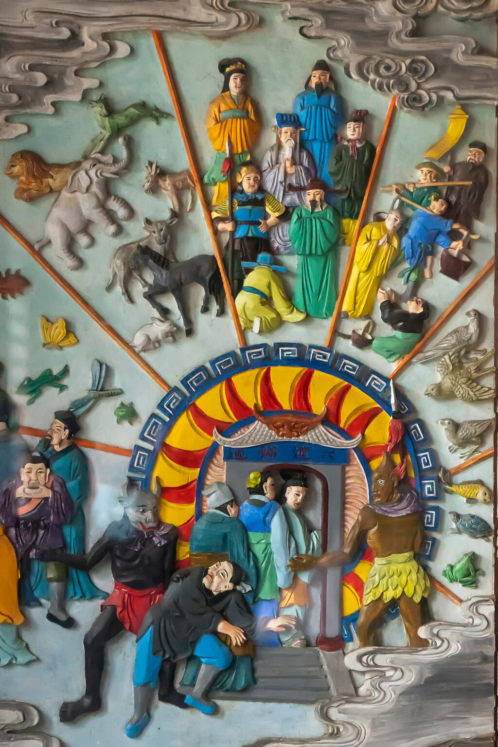 往东过了金刚延寿塔,那是地藏殿。地藏殿内供地藏菩萨像,它的侧墙上也是套色木刻,非常漂亮。看看其中一幅《六道轮回》。