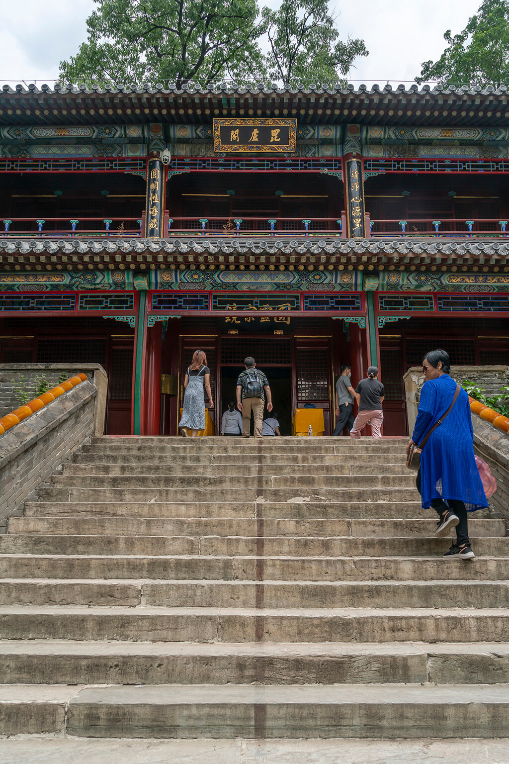 上面那是二层的毗卢阁。毗卢阁面阔七间进深二间,斗拱抬梁结构,黄色琉璃瓦绿剪边单檐硬山顶。上下有檐廊,上檐下挂“毗卢阁”横匾,说是康熙手笔;下层门楣上挂“圆灵宗境”横匾,说是乾隆手笔。进去看看。