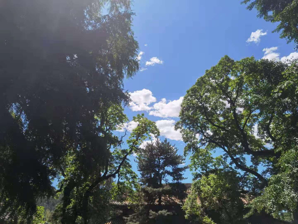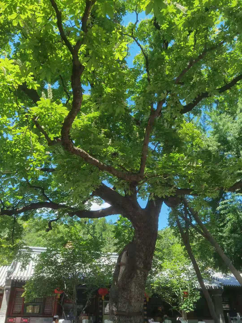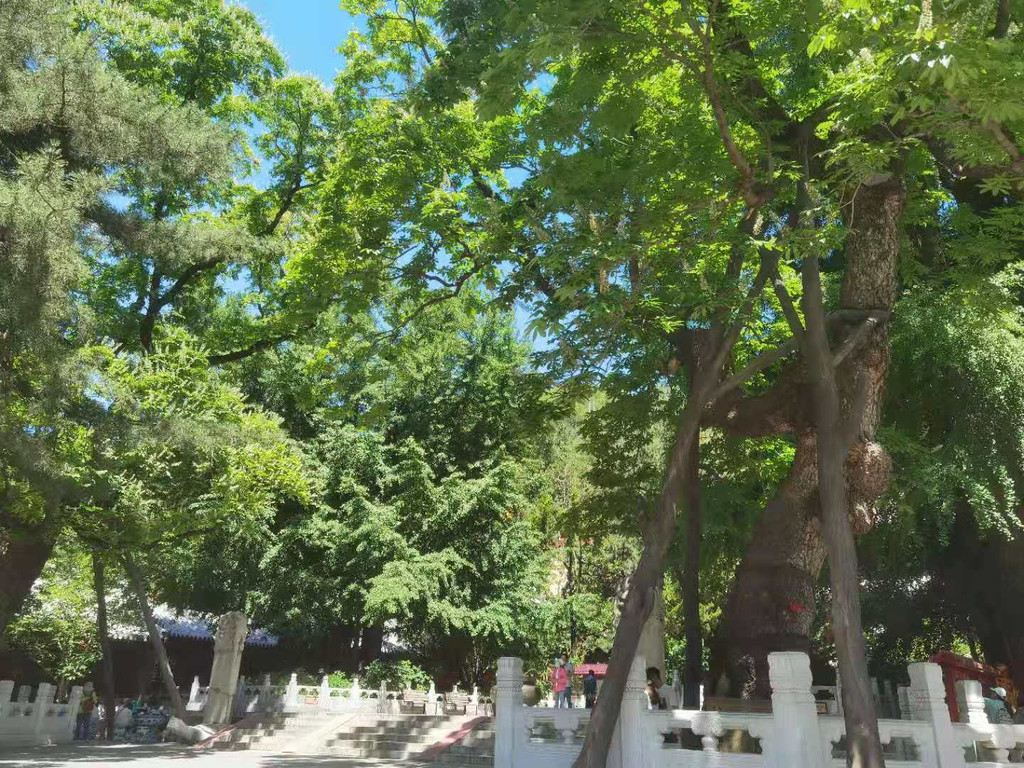进入景区后入眼大雄宝殿,烧香拜佛的人还是挺多的,大家都虔诚的买香跪拜,祈愿自己的愿望能够实现,进入寺院就是有这种神奇的力量,看到的每个人面容都是真诚微笑的,继续走着,来到卢阁殿,院中有两颗高大的古娑罗树,导游有介绍它们是唐代所植。相传它们和下塔院处的两颗古娑罗树都是从西域移植来的。娑罗树虬曲苍劲,历经沧桑仍不忘新生,据说在每年的五月中下旬,娑罗花盛开时,一座座小宝 塔似的雪白的花絮嘉立在树冠外围,满树洁 白,分外绚丽。数百年来静看这山寺中的四季轮回,不但把深山古刹点裰的古香古色,同时也增加了古刹的深秘色彩。