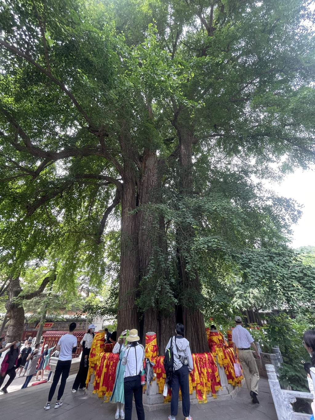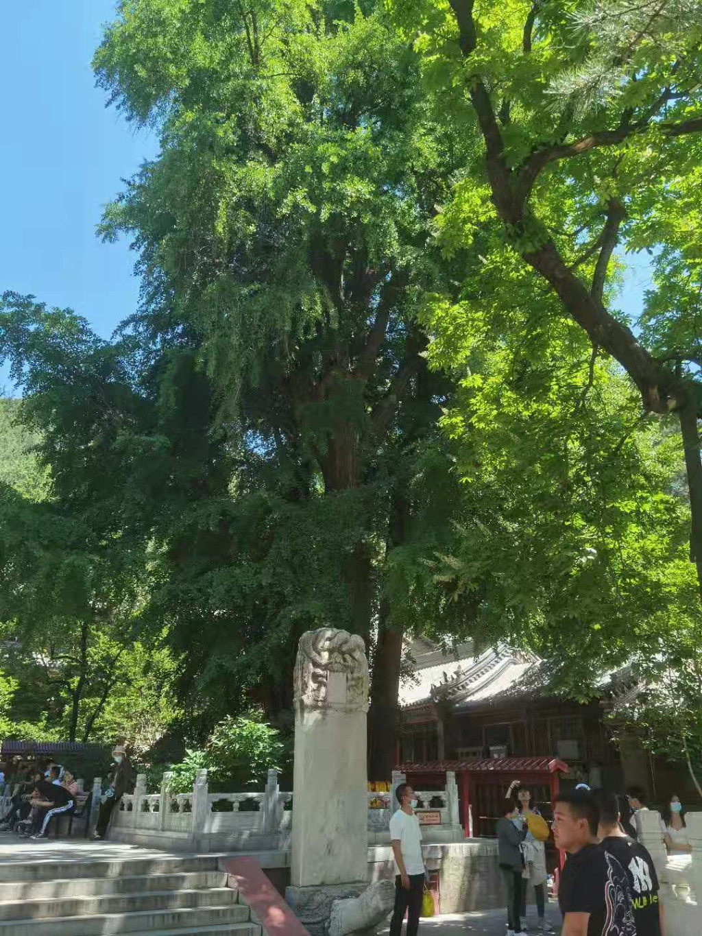 再看旁边站着人最多的这就是有名的银杏树了,据《西山名胜记》记载:“帝王树,言在清代,每一帝王继位,即自根间生一新干,久之与老干渐合。至宣统时,复出一干,至今仍不发达”。“帝王树”和“配王树”是北京最著名的古银杏。