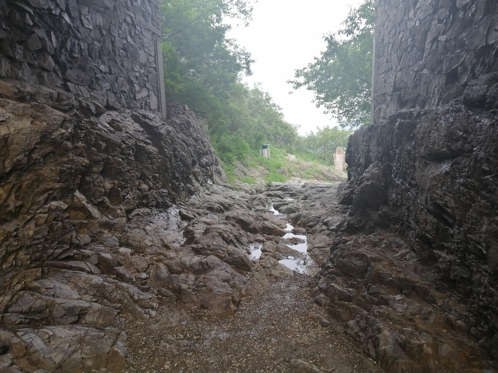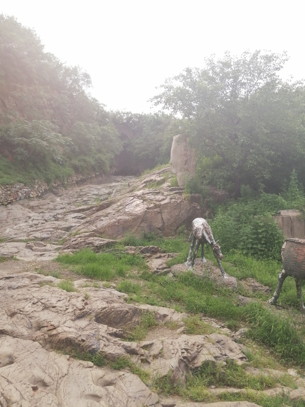 牛角岭的古道保存很完整,正好能看出古道从山脚下盘旋而上,在山顶穿过关城城券,再“翻山”而下。古道上的一串串或深或浅的蹄印清晰可见,而蹄窝最集中的就在关城城券下面的一段,牛角岭山顶是一整块巨石,这一段古道就是在这块巨石上凿出来的,路面凹凸不平,几百年的踏磨让石头的天然纹理更加光滑清晰,与蹄窝印交织在一起,像是在诉说着千年沧桑。