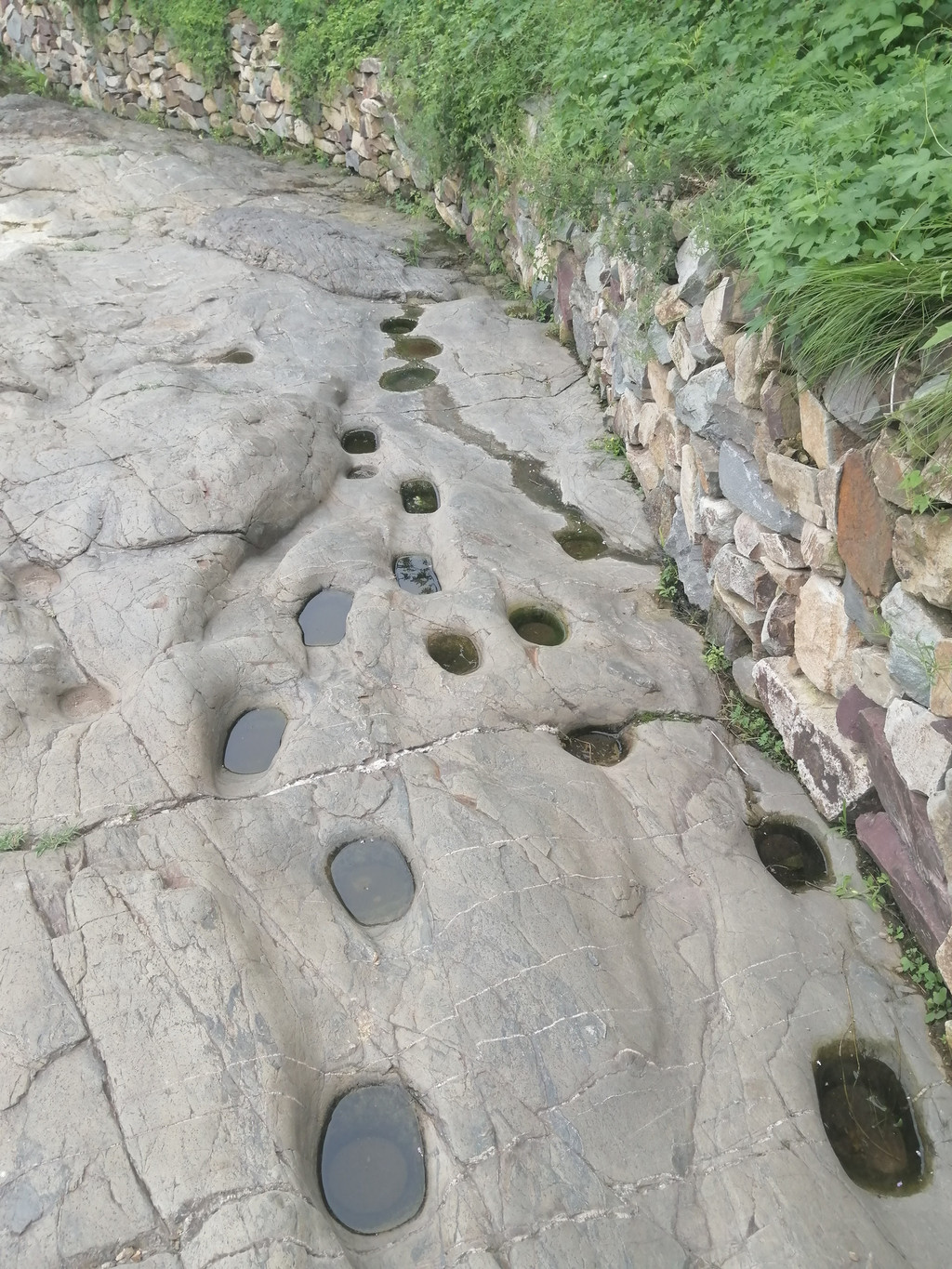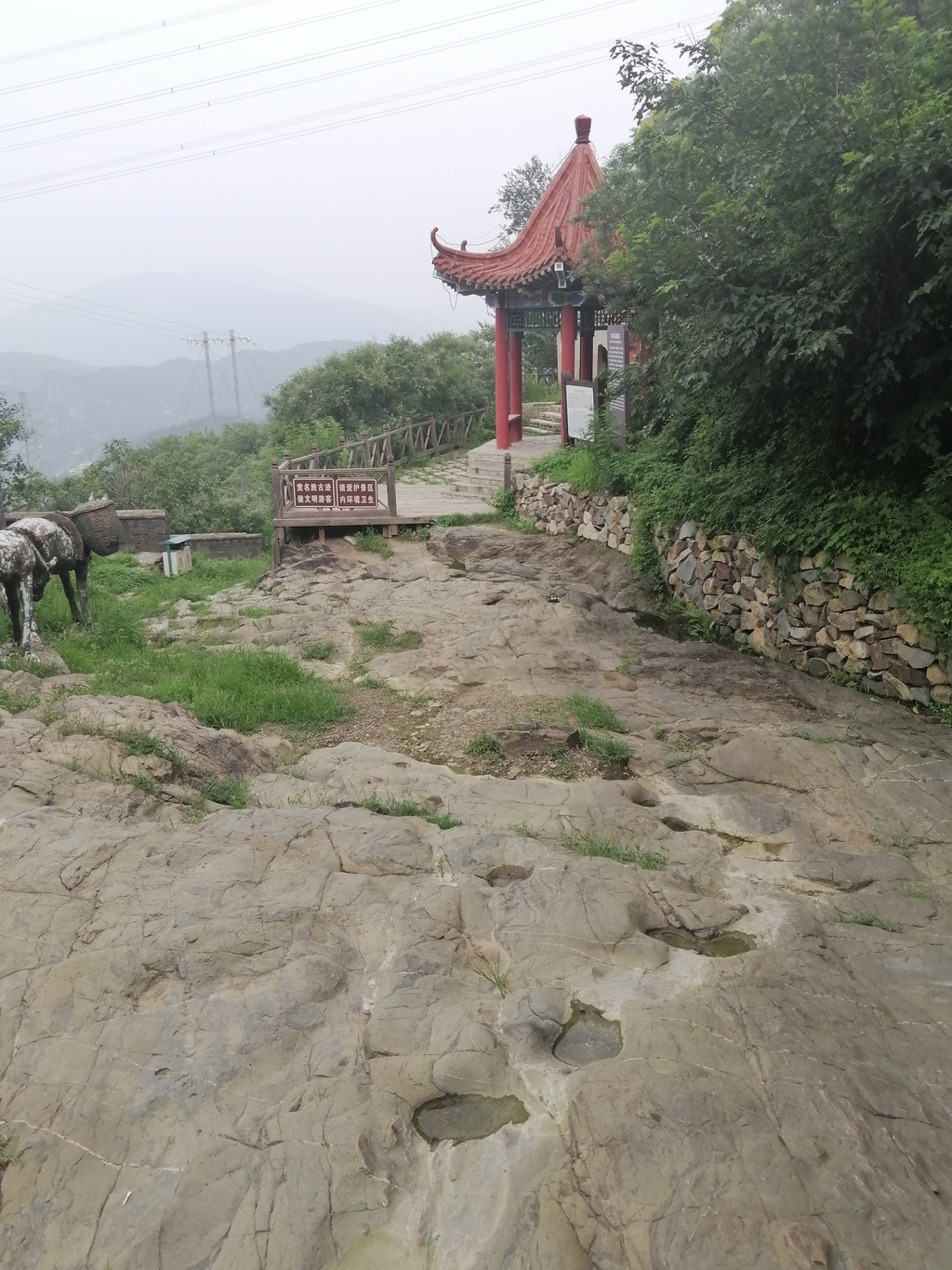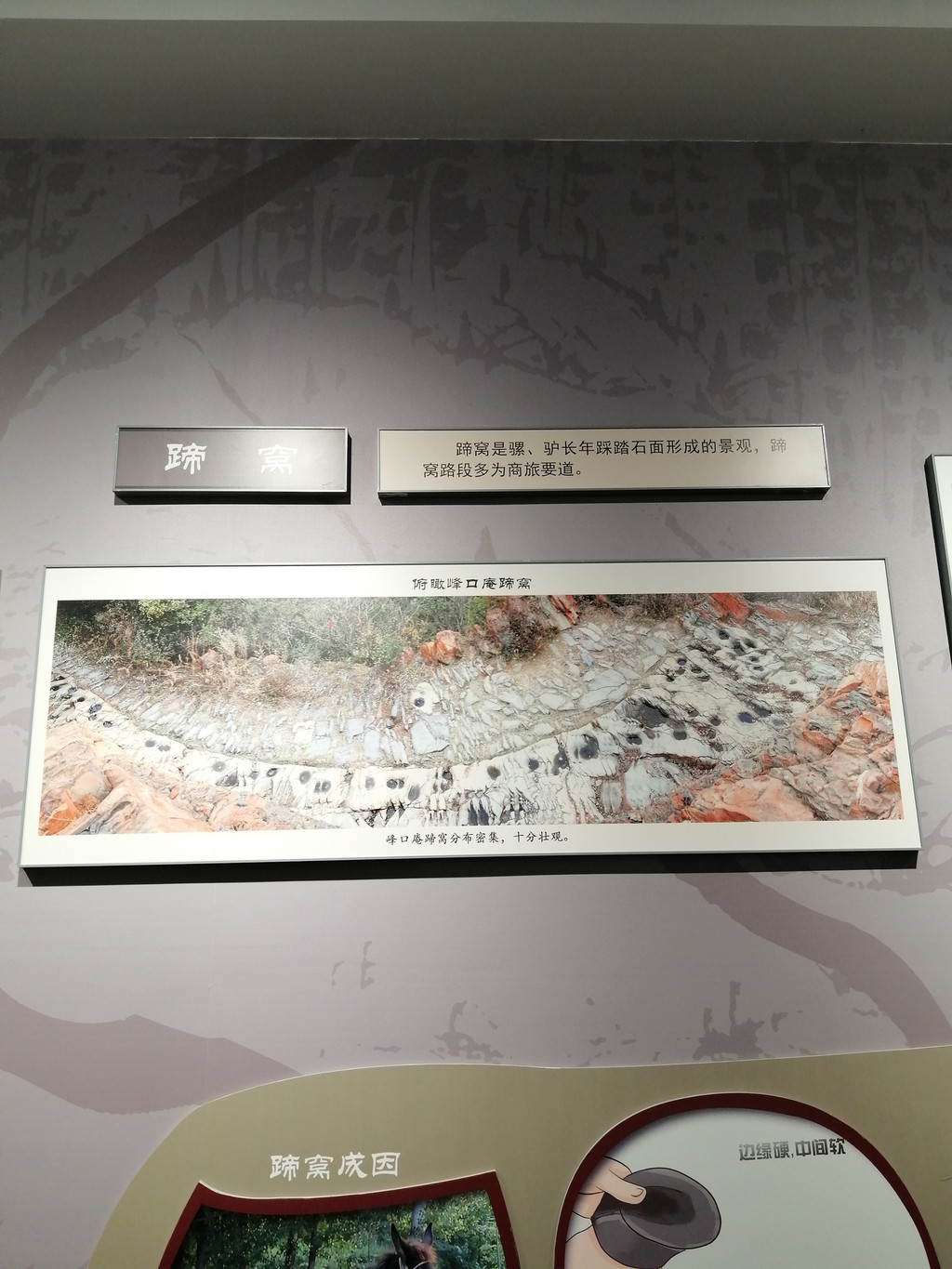 京西古道是京城连接河北、山西和内蒙的重要通道。数百年间,运货拉煤的驴马成群结队,年复一年、日夜不断地穿行往来,把古道上铺就的坚硬的石块踩磨得锃光瓦亮,在基岩路面或者较大的石块上留下了永久的痕迹,那就是长时间持续踩踏形成的串串蹄窝。它们有时零星散布在较大的石块表面,有时三三两两地出现在小面积裸露的基岩路面,更多的蹄窝成群、成串出现在峰口鞍、牛角岭和石佛岭三个完全由人工开凿的基岩路段。