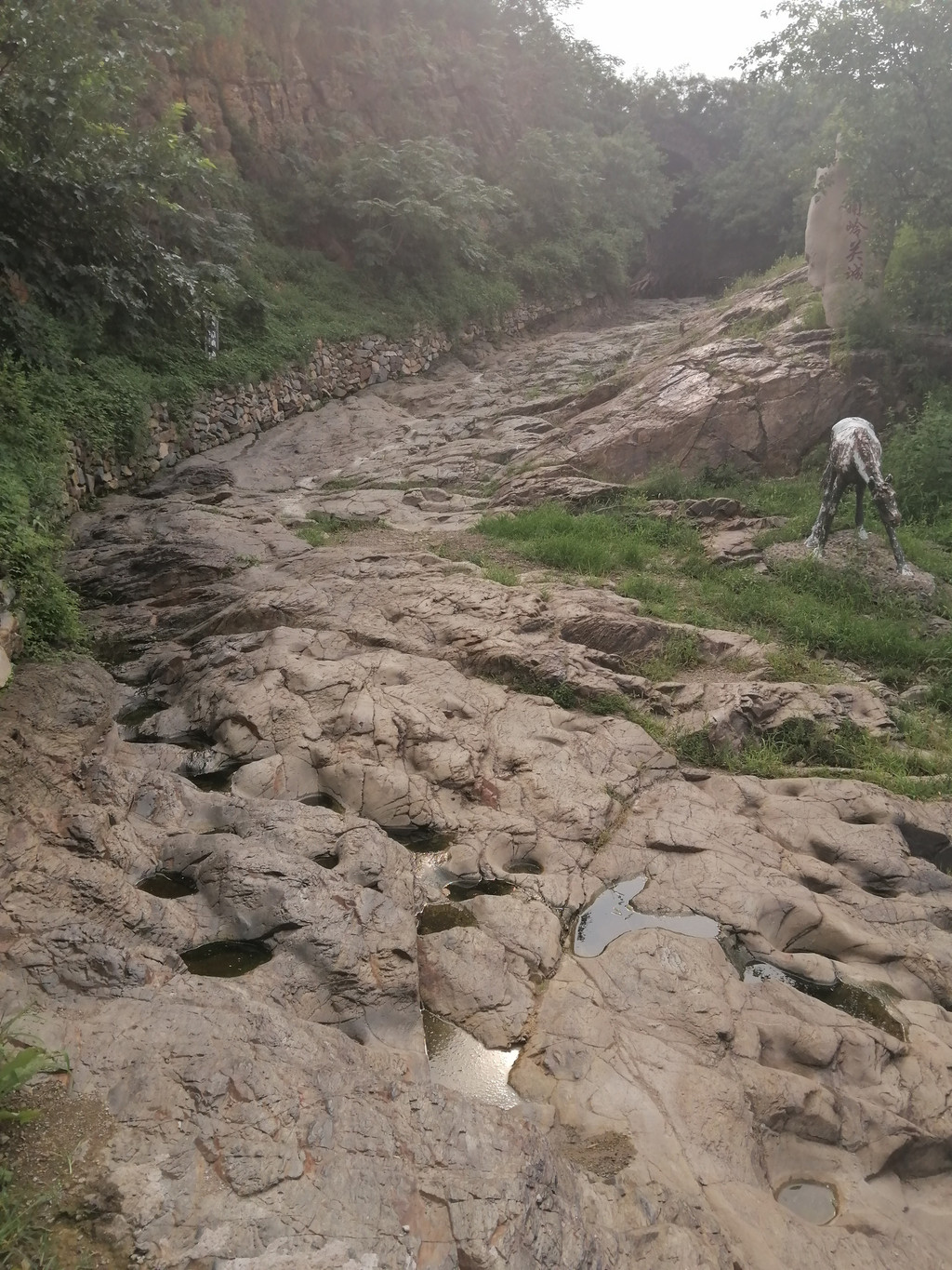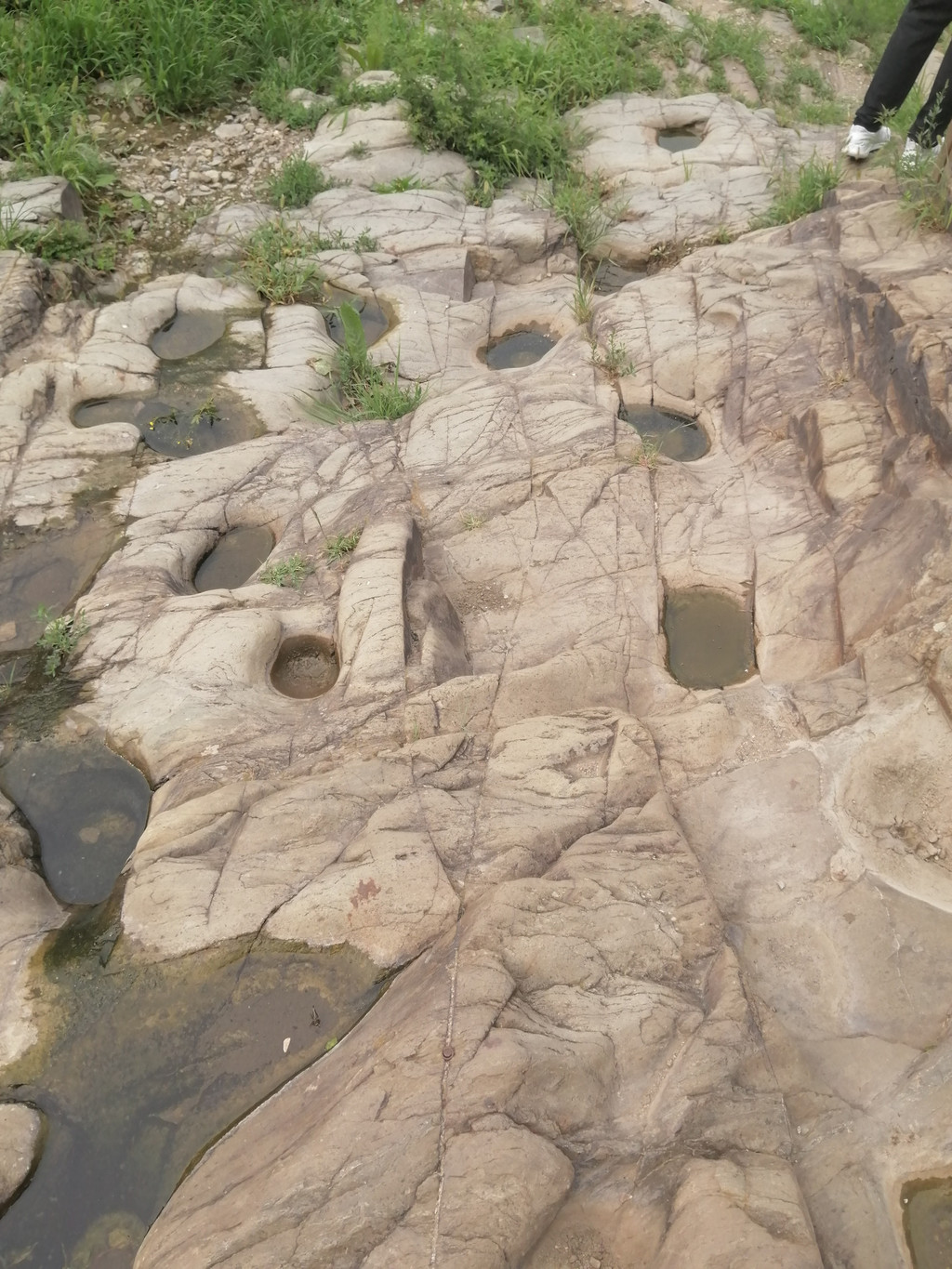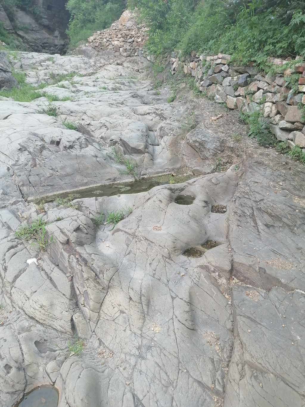 京西古道是京城连接河北、山西和内蒙的重要通道。数百年间,运货拉煤的驴马成群结队,年复一年、日夜不断地穿行往来,把古道上铺就的坚硬的石块踩磨得锃光瓦亮,在基岩路面或者较大的石块上留下了永久的痕迹,那就是长时间持续踩踏形成的串串蹄窝。它们有时零星散布在较大的石块表面,有时三三两两地出现在小面积裸露的基岩路面,更多的蹄窝成群、成串出现在峰口鞍、牛角岭和石佛岭三个完全由人工开凿的基岩路段。