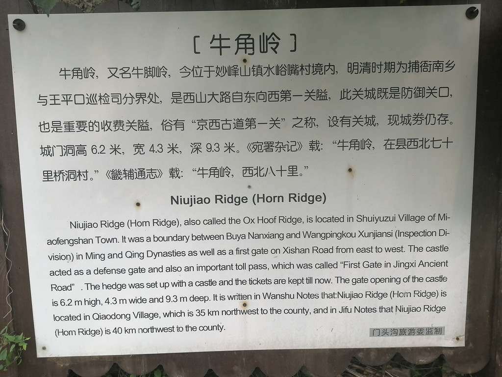 在京西古道上行走,韭园村的牛角岭关城,是必去的地点。牛角岭关城在门头沟区王平镇韭园村东的山岭上,属京西最古老的“西山大道”上的重要关口,也是出行的第一个关口。牛角岭关城又名牛脚岭关城。明清时期是宛平县捕卫南乡与王平口巡检司分界处,建有关城,至今城垣犹存。今天是妙峰山镇与王平镇的分水岭。牛角岭关城是西山大路自东向西第一隘口,关城建在两山坡对峙之处,扼守着古道之要冲。古代这里有官吏把手,对过往商旅收取过路费用。牛角岭关城坐东朝西,砖石结构,在山石上直接用石块垒砌,青砖券边,青石做腿。门洞高7米,进深9.3米,横宽4.3米,体量甚大。