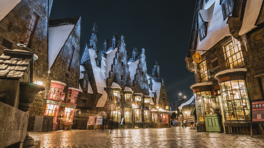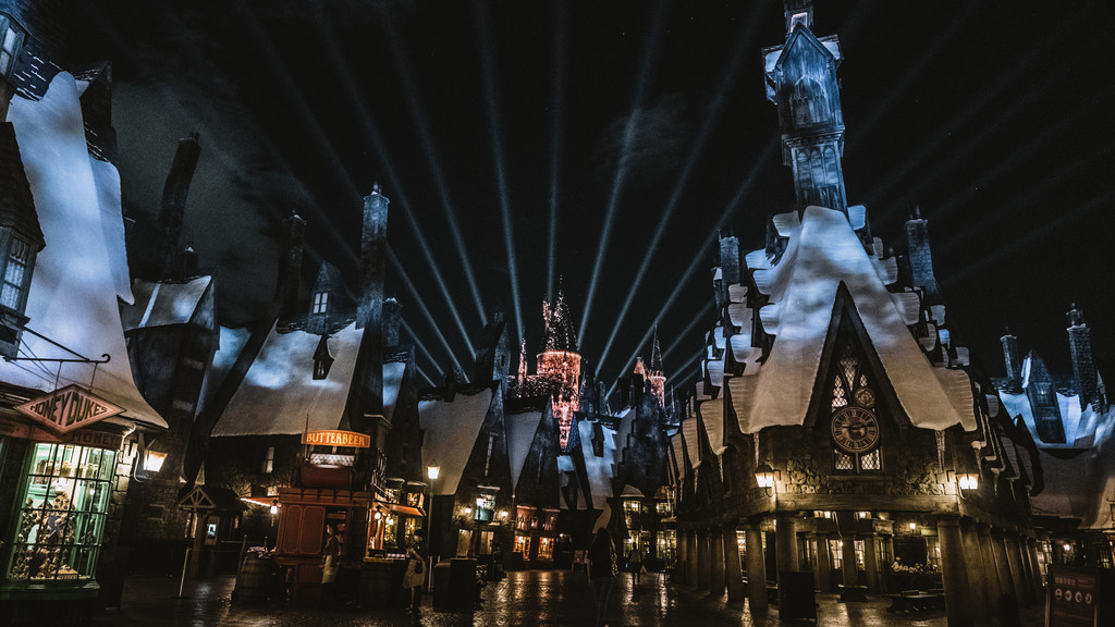 当夜幕来临时,这个世界开始展露出它迷人的另一面,城堡在黑夜里披上了绚丽的外衣。奇幻的夜间灯光庆典照亮了霍格沃茨城堡,再来上一杯著名的黄油啤酒(不含酒精),完美。