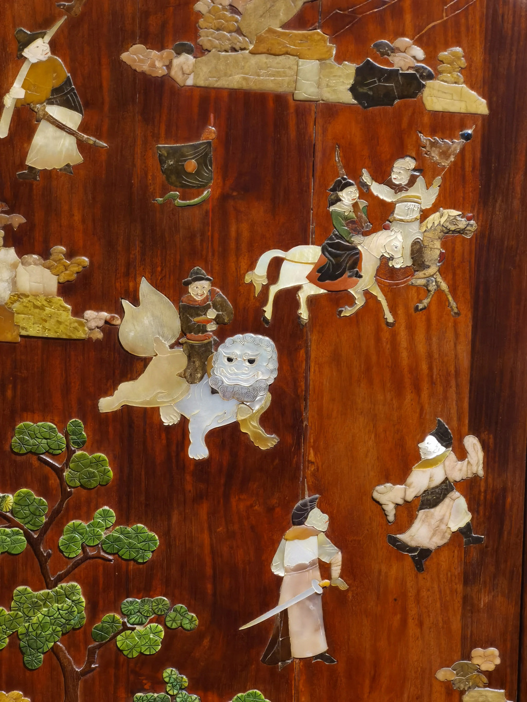 这是黄花梨木百宝嵌番人进宝图顶箱立柜: