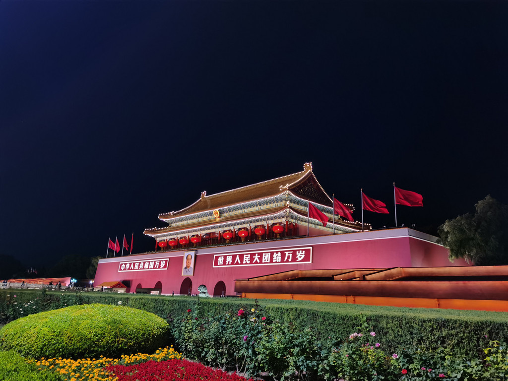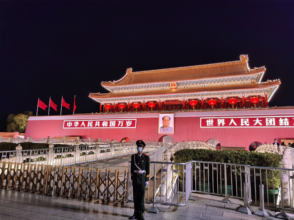 去国家大剧院的路上不可避免地要路过天安门,因为疫情关系,也为控制人流,天安门广场前设置了安检通道,就算路过也要出示身份证量过体温验过健康码才能放行。既然来都来了,那就给天安门夜景留个影吧: