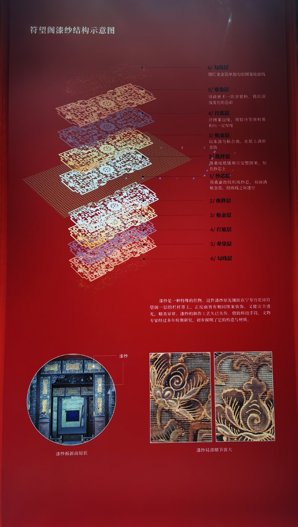 “符望阁漆纱”保存难度大的主要原因是它非常薄,厚度和一张普通的A4纸类似,融合制罗工艺、漆艺和纸彩绘制等三种传统工艺,由纱芯层、纸样层、贴金层、打底层、晕染层、勾线层共六层构成,从层次上看,就可以知道制作流程非常复杂。