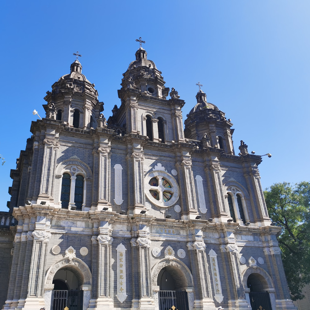 中午我们办好入住,就开始在周围逛起来。在步行可达的王府井天主教堂前驻足,看人家拍婚纱照,天空蓝得很上镜: