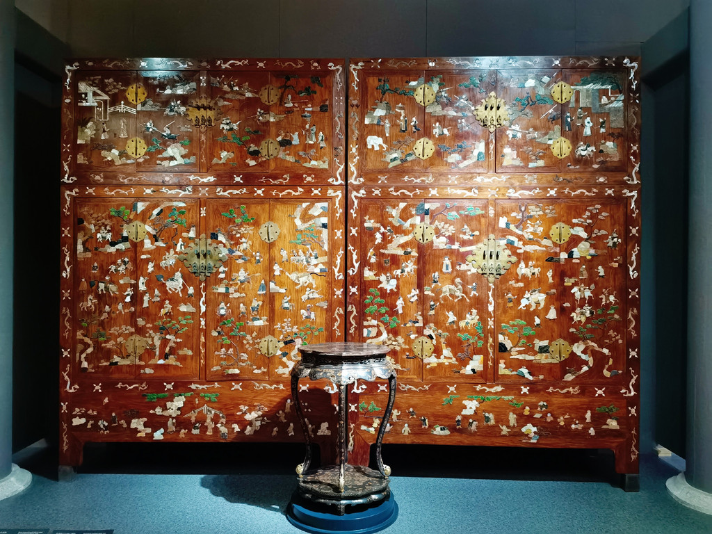 柜以黄花梨木包镶,分为上下两部分,并各装四门,正中可开,两侧可卸,门上装铜合页与铜锁鼻。柜面用螺钿、田黄石等嵌出各种人物、异兽、山石、花木,上层为历史故事画,下层为番人进宝图,柜肚为婴戏图,边框饰螭龙纹。方足铜包脚。柜面所嵌饰件高于面板,具有立体感。于黄花梨材上作镶嵌装饰,在家具工艺中较为少见。