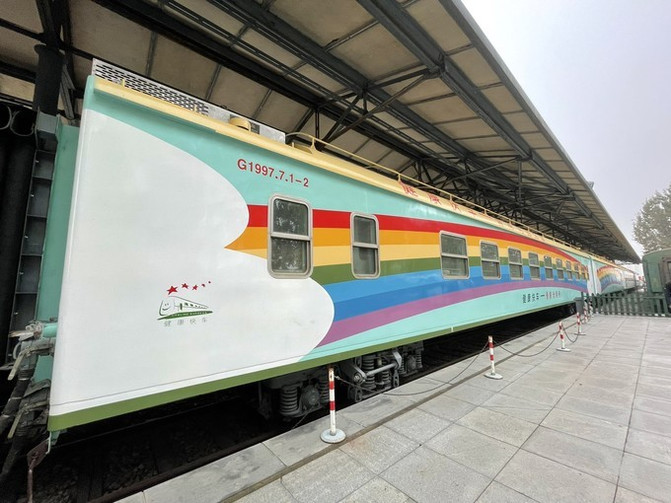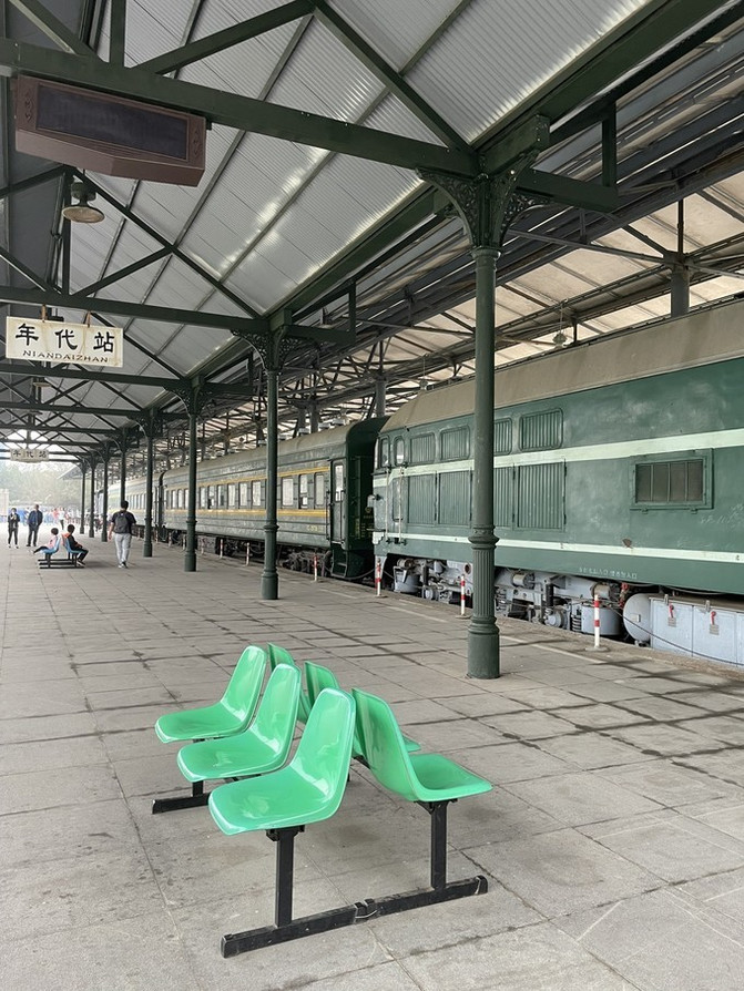 别有韵味,带着那个时代的沧桑和古朴,别说现在的孩子,就是我这个80后都没见过,坐在候车的椅子上体会一下,似乎穿越回了那个年代。“ 香港 光明号”彩虹列车格外显眼,只可惜不能进去参观,和彩虹车厢合个影也不错。再往前还有一个观景台,各人认为是看火车的,但是等了半天没碰上火车经过。室内陈列着不同时期、类型及制式的机车车辆近百台,尤以 中国 现存最早的“0”号蒸汽机车及以革命领袖名字命名的“毛泽东号”、“朱德号”机车堪称 中国 铁路文物中的“瑰宝”。其中,“毛泽东号”可以付费(10元/人,包括儿童)上车参观,第一次去的建议上去看看,还是挺意外的。包厢里不但有卫生间还有办公的书桌,会议室。全套中式内饰,挂穗儿的窗帘,昏暗古朴的台灯和书桌上整齐摆放的书籍,都把我们带入一种新 中国 初期的氛围里。