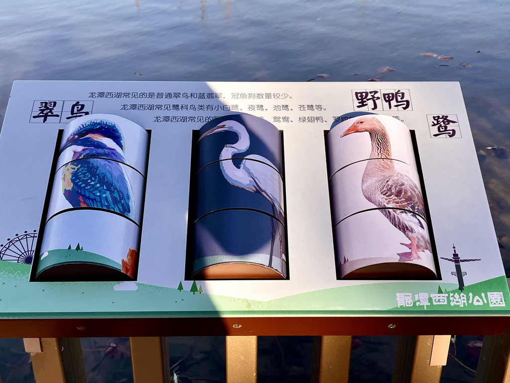 西湖公园共有绿地近3万平方米,绿化覆盖率达56%。公园还设置了滨水栈道,南柳堤,观景平台,荷田柳堤,观景亭等景点。公园里有很多体现动植物多样性的科普宣传牌。比如专门介绍鸳鸯,有画片,有二维码,扫一扫能听鸳鸯的叫声等。
