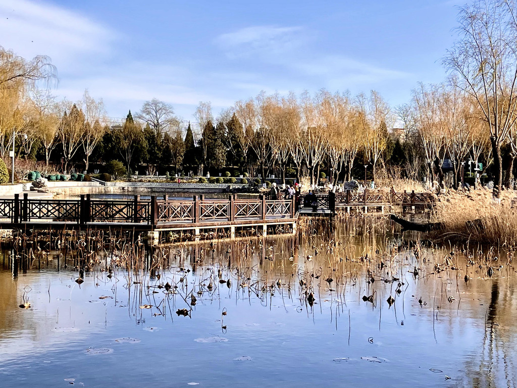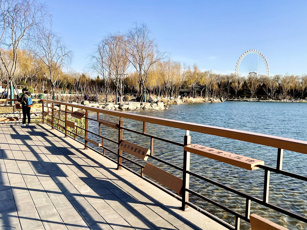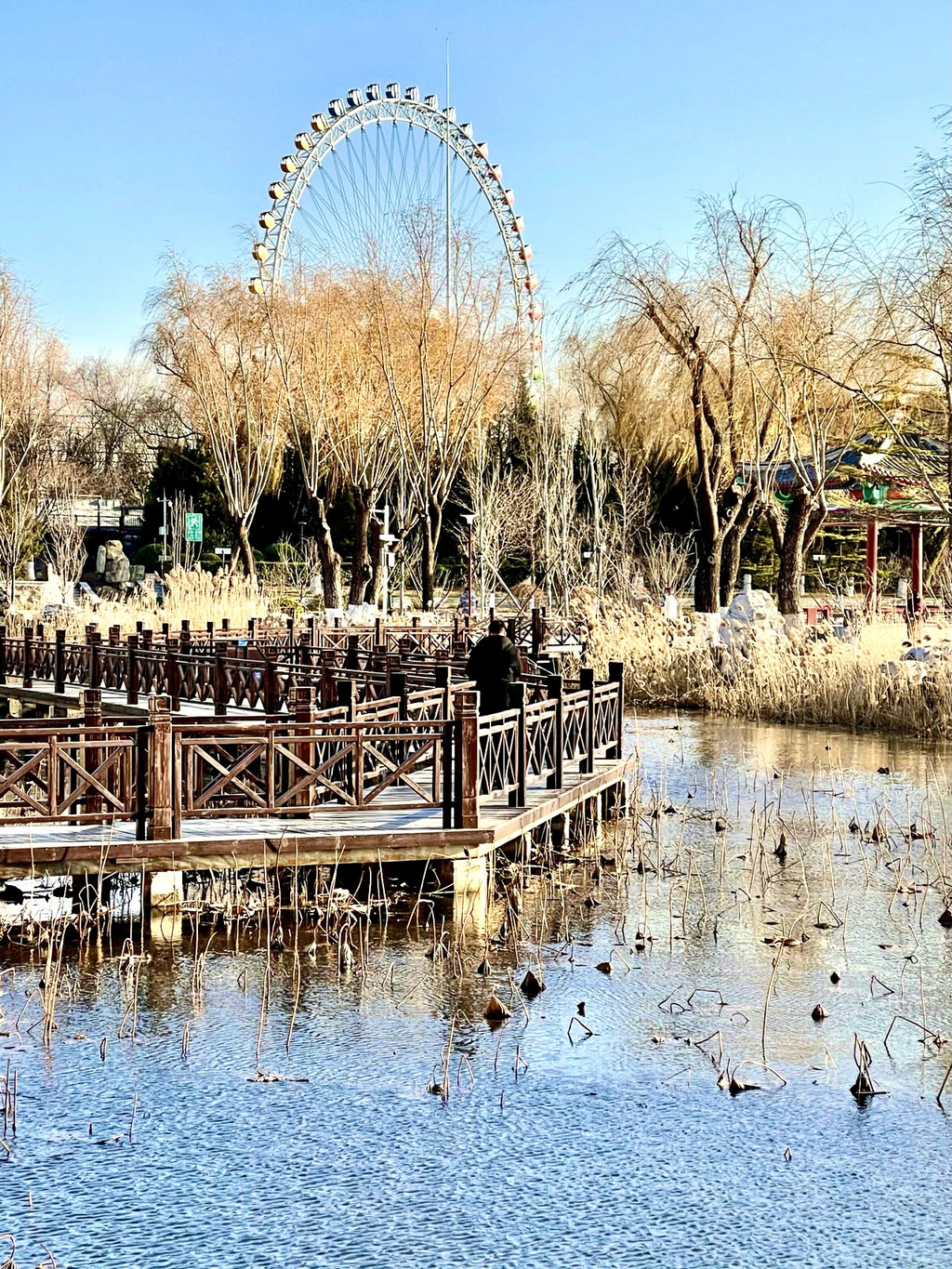 今天前去打卡,沿湖走一圈,明媚阳光下,湖水碧波荡漾,枯荷展示最后的凄美,还有成片的芦苇,棉絮般的芦苇花,在微风中摇曳。远处的上世纪京城第一个游乐园遗留下来大转轮高高屹立。