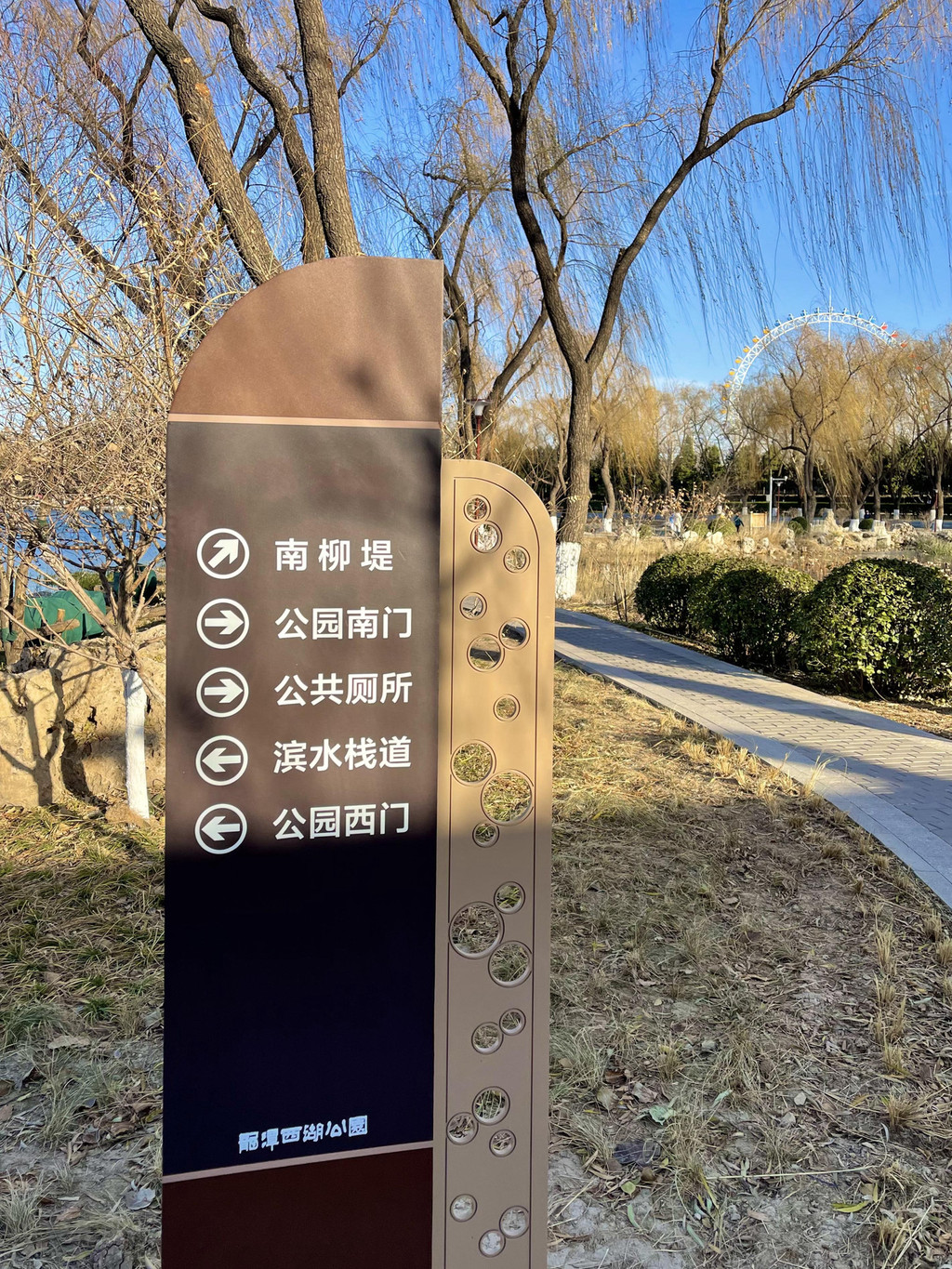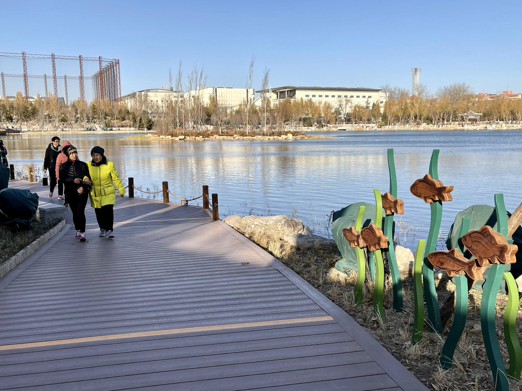 西湖公园以湖为中心,3米宽的红色沥青路面围绕湖面,供游客散步或慢跑。紧贴着湖面还有一条亲水步道,一路观景,夏季观荷,现在可以看到很多枯荷。