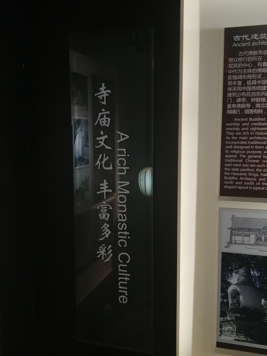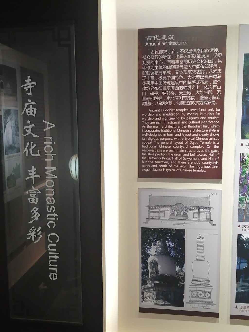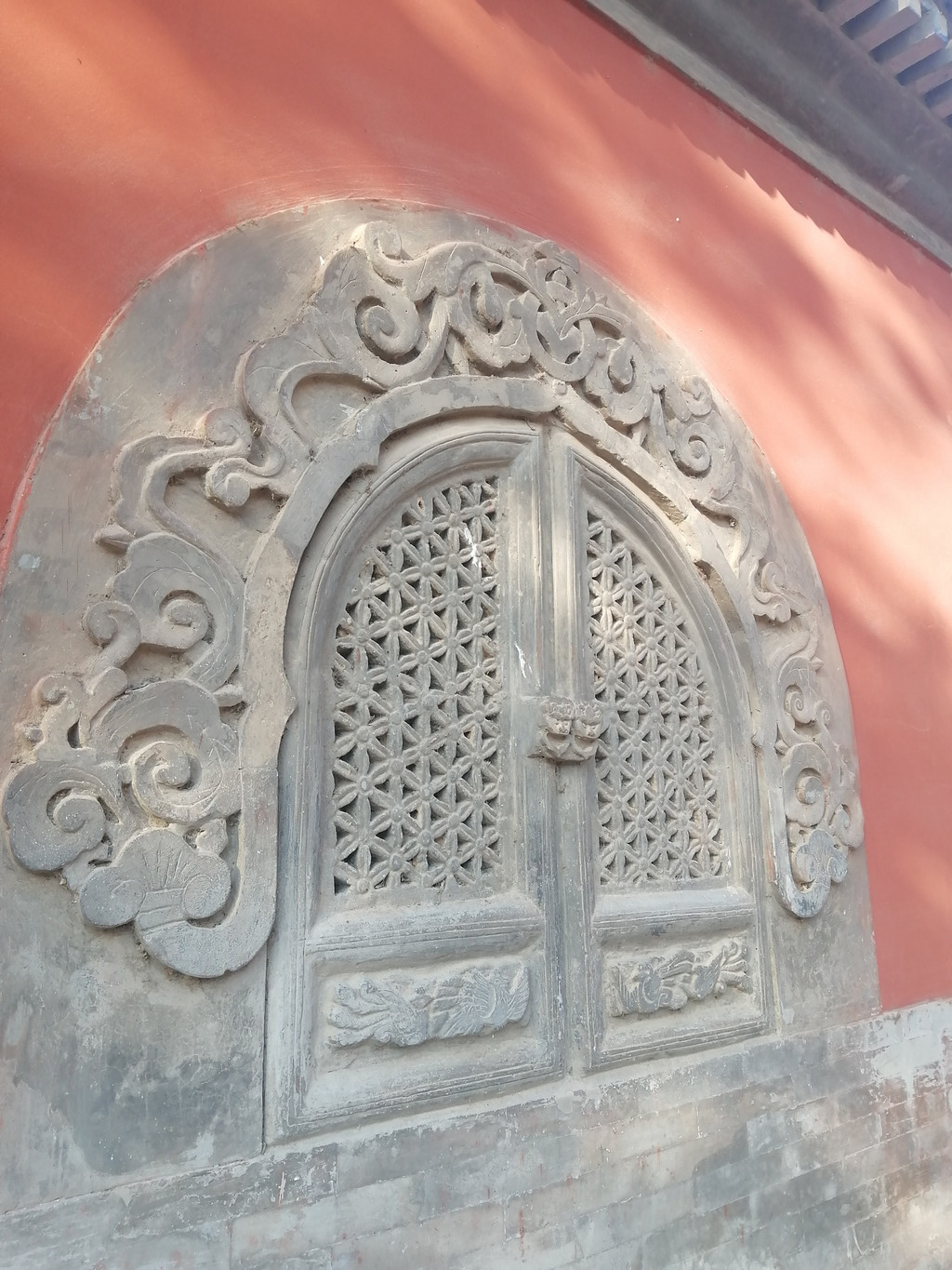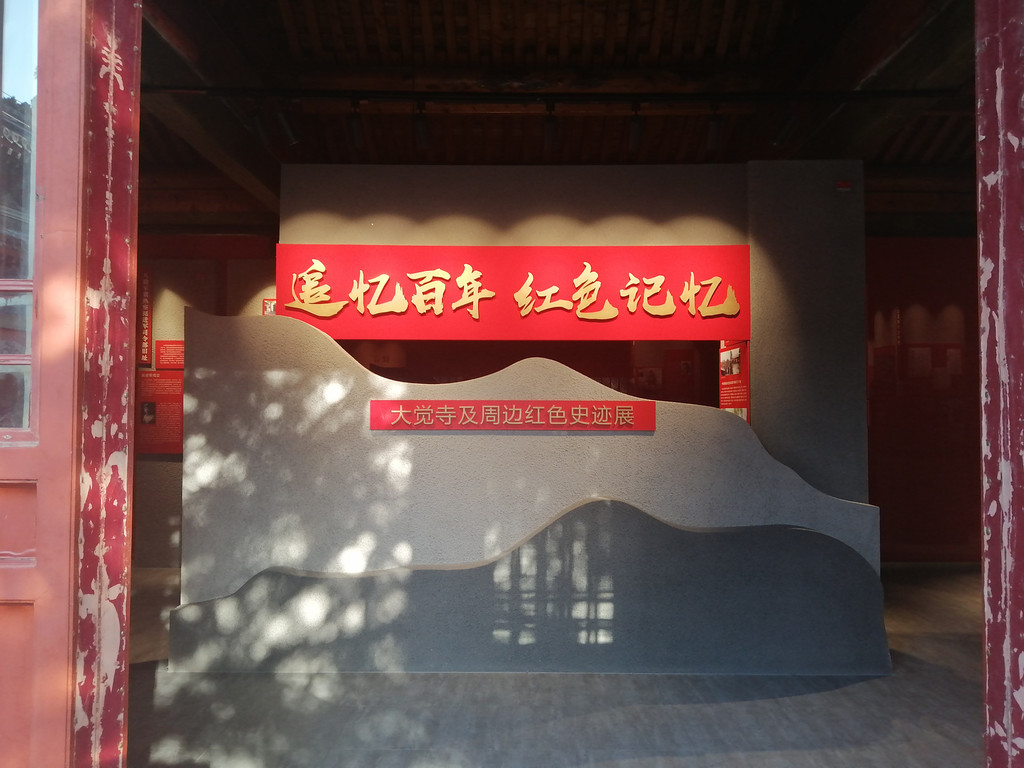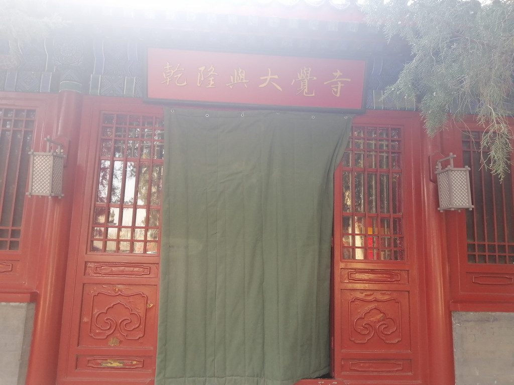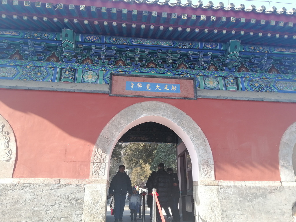 山门为三间带斗拱的歇山式建筑,砖石结构,中间开拱门,上有匾额“救建大觉禅寺”。山门左右有八字形影壁,为影壁中等极最高者。
