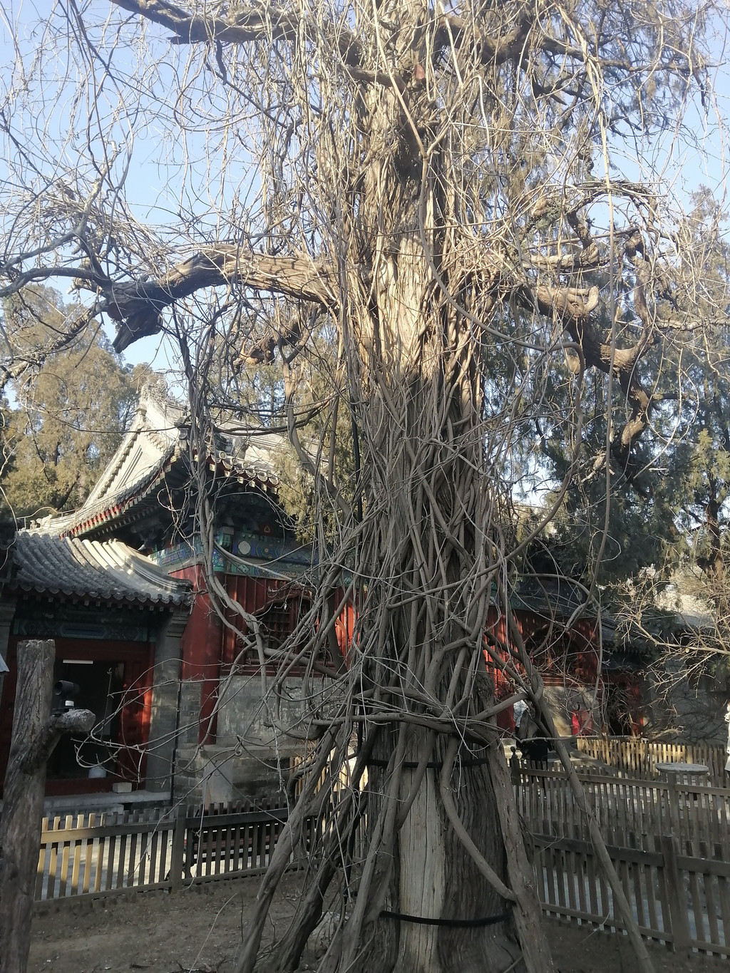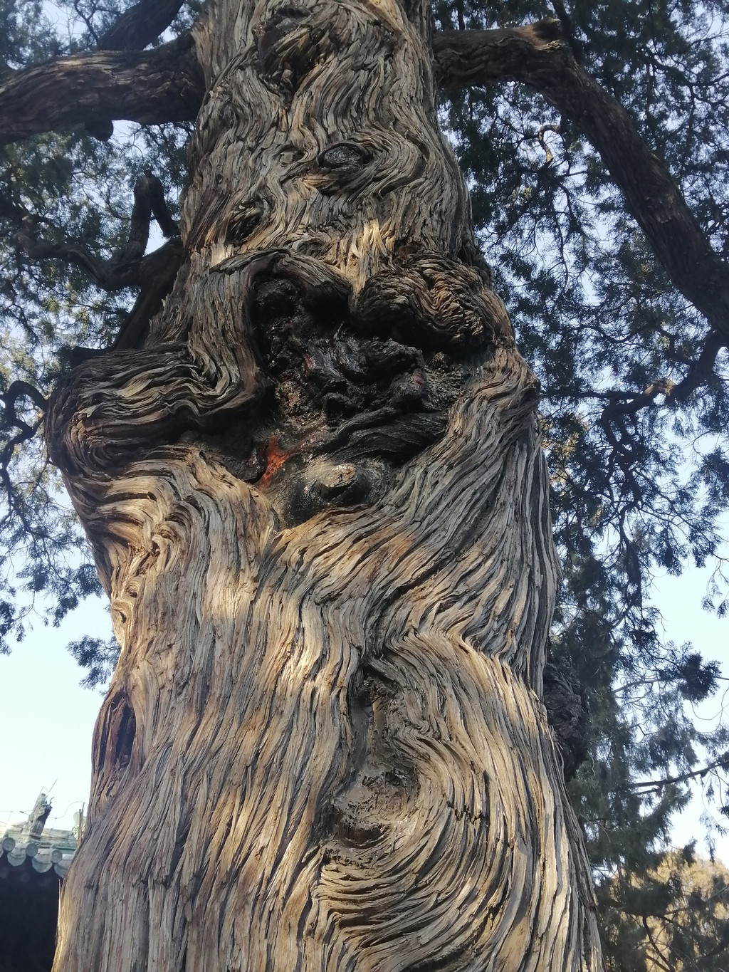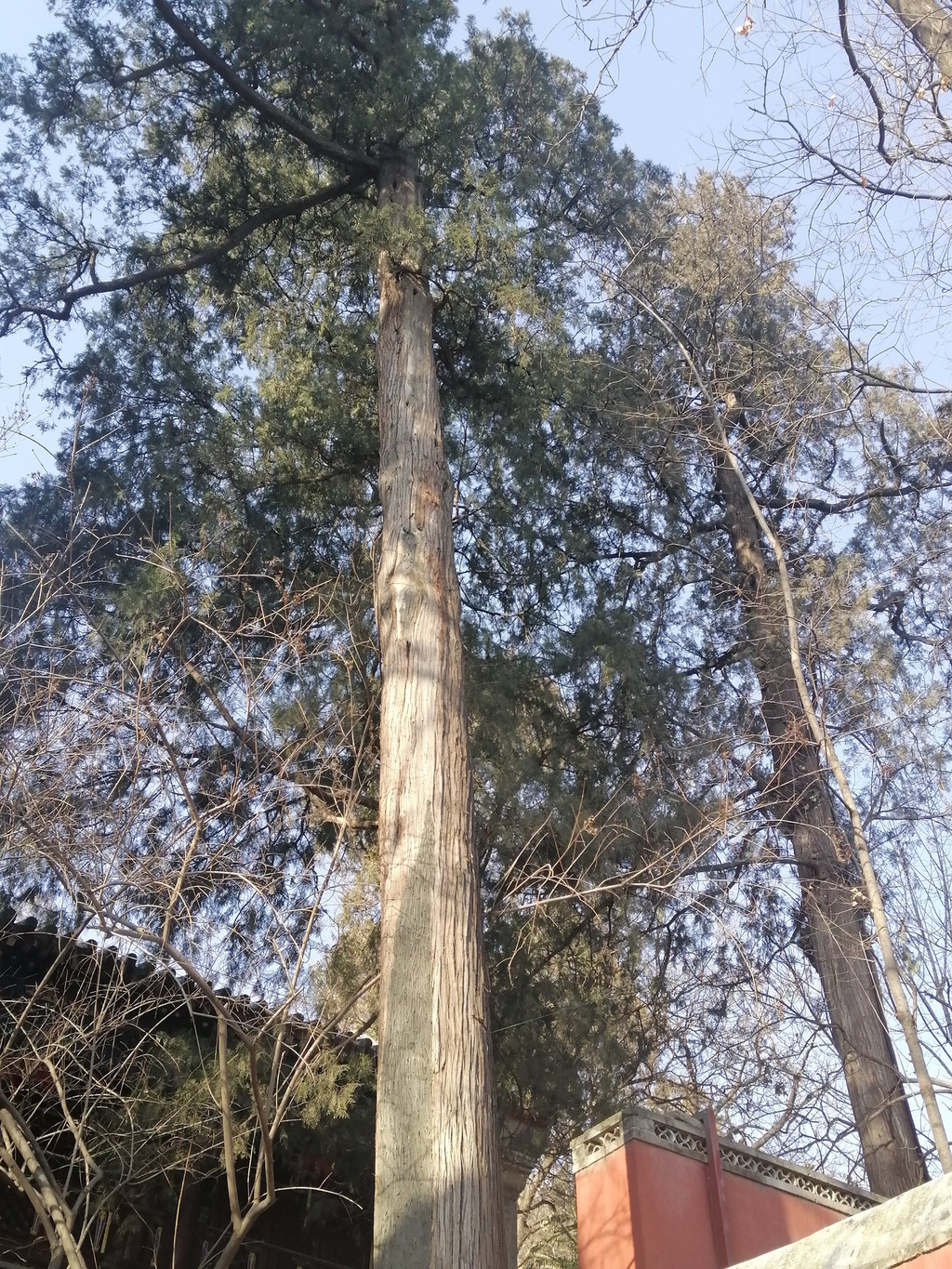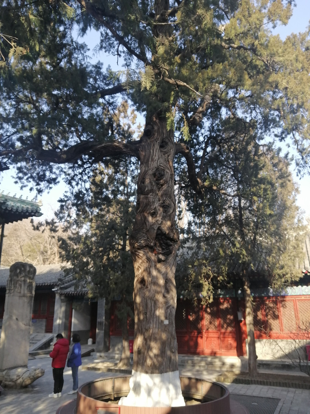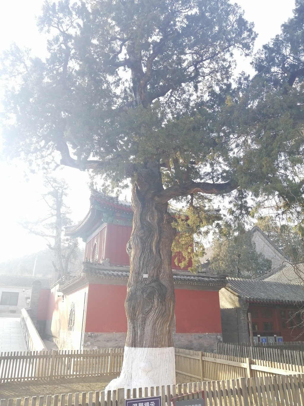 一绝“老腾寄柏”:在山门内,功德池的石桥东端有一株古老的桧柏树,根结如瘤,足有五百多年的树龄,在树干半空的心部,寄生着一株老藤,粗壮的躯干显示出它已有近百年的历史了。