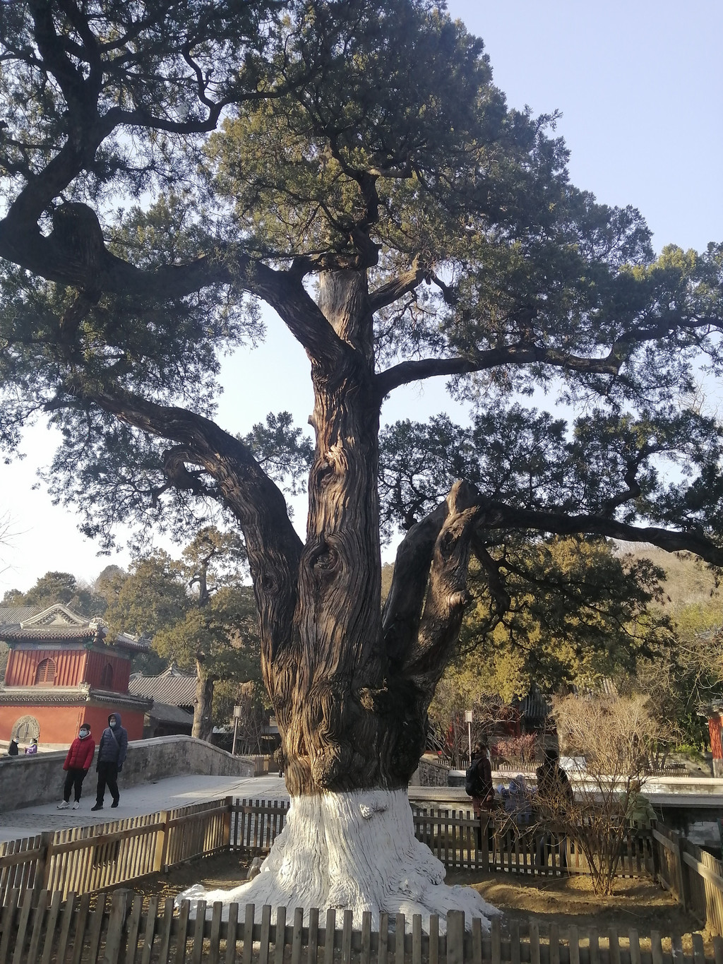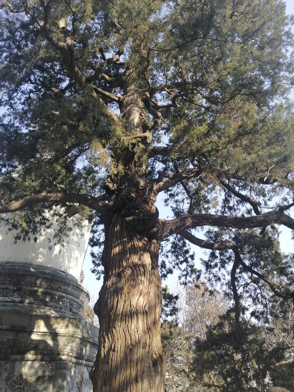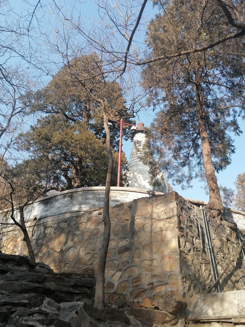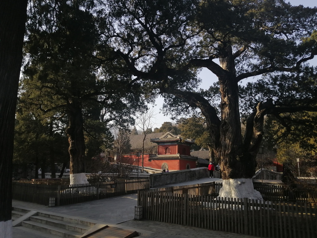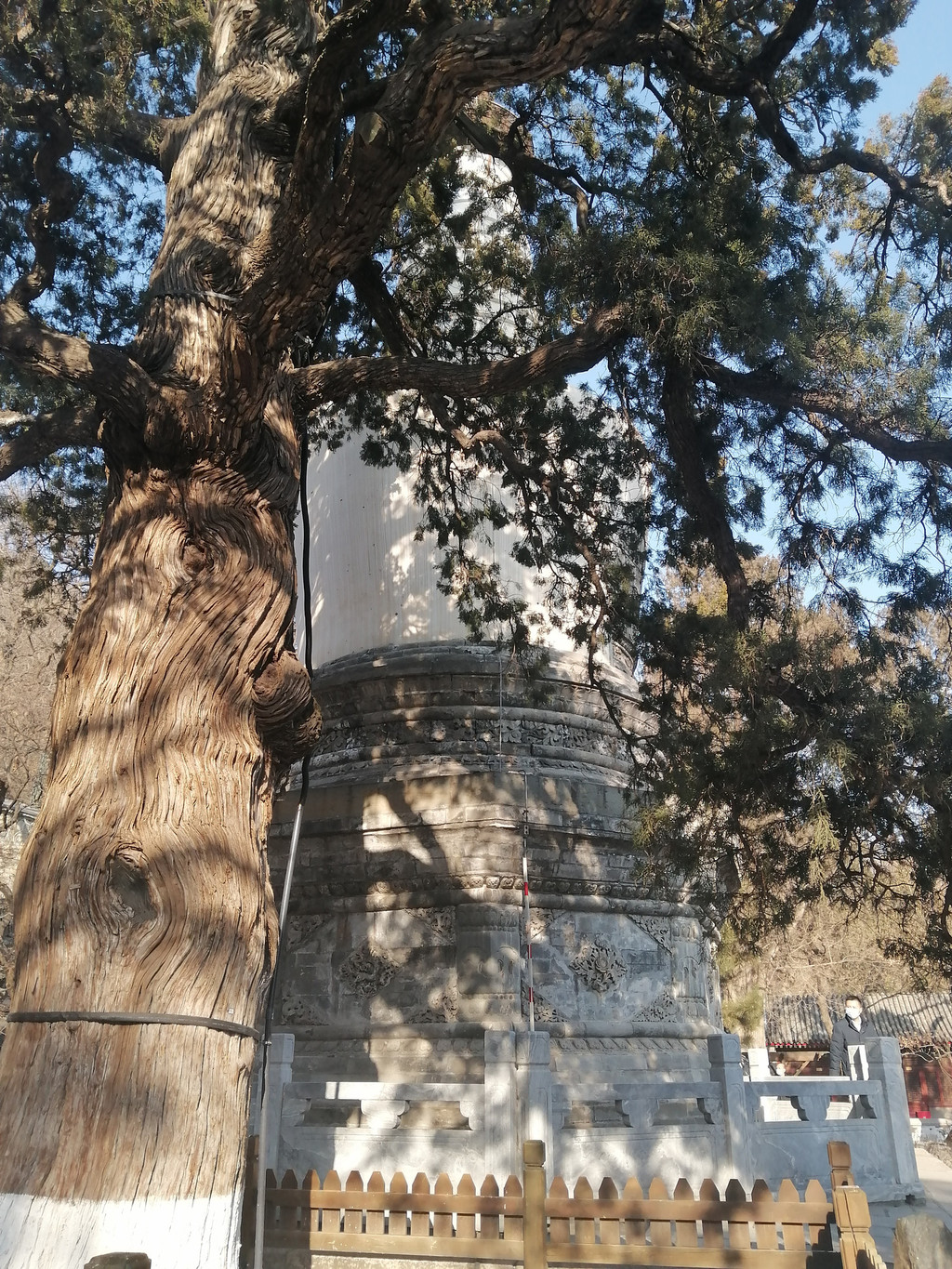 八绝“古松抱塔”:大悲坛后,立着一座白塔。塔为覆钵式,正面开着“眼光门”。塔顶的华盖上系有风铎。塔旁两株古老的油松虬(qiú)枝盘绕,将塔合抱其中。