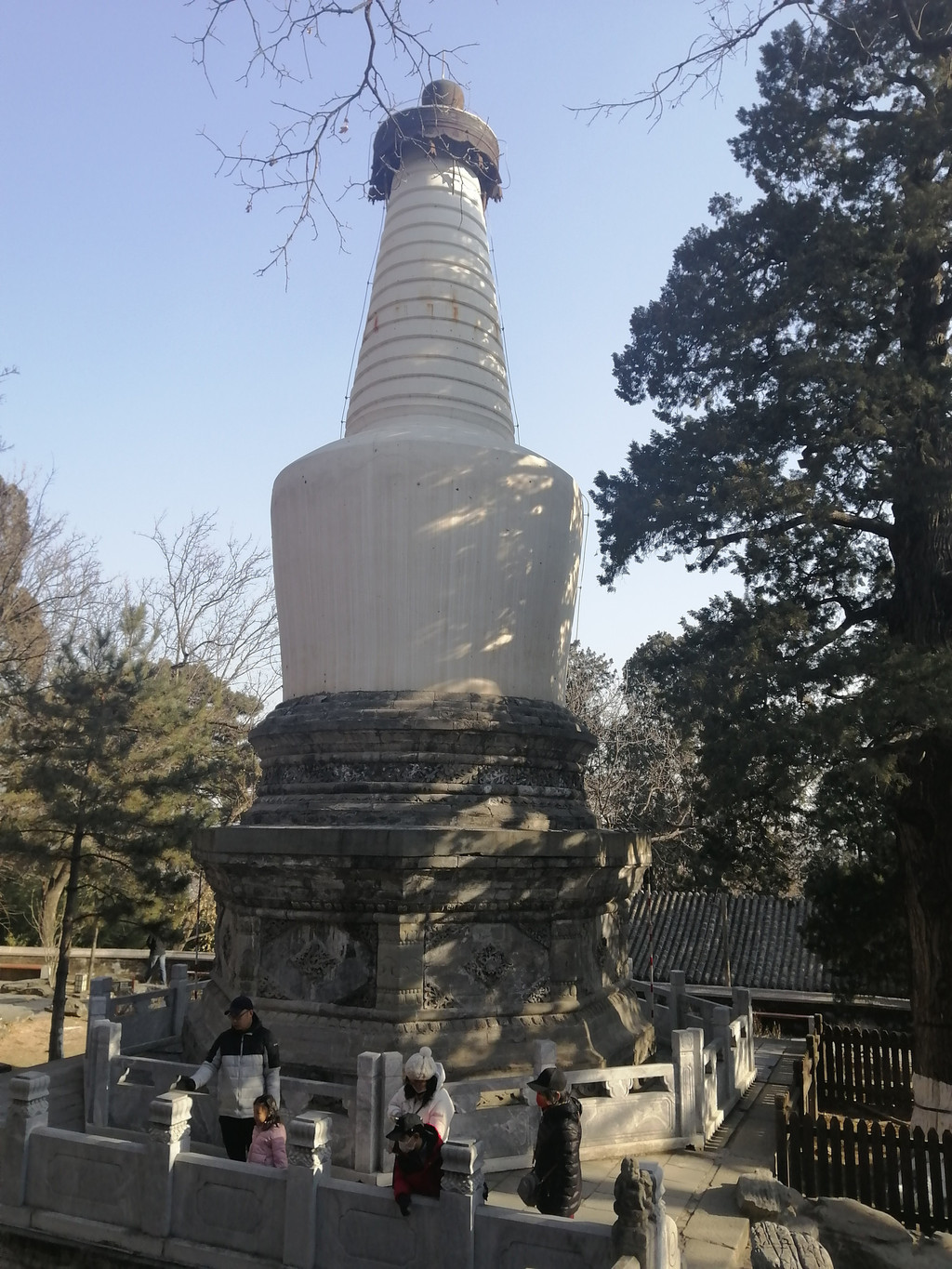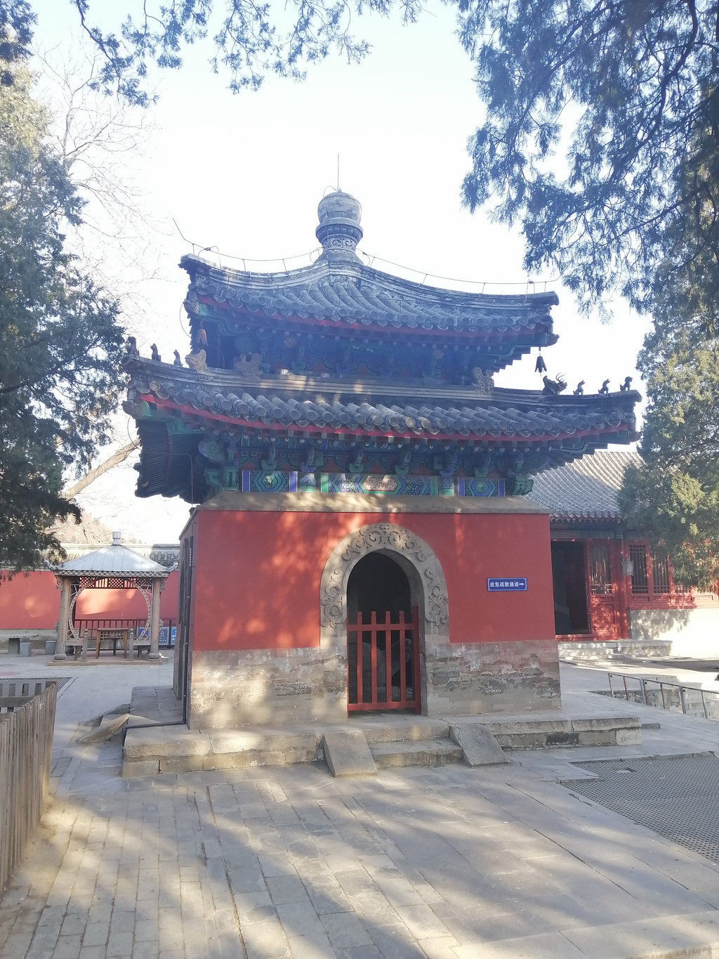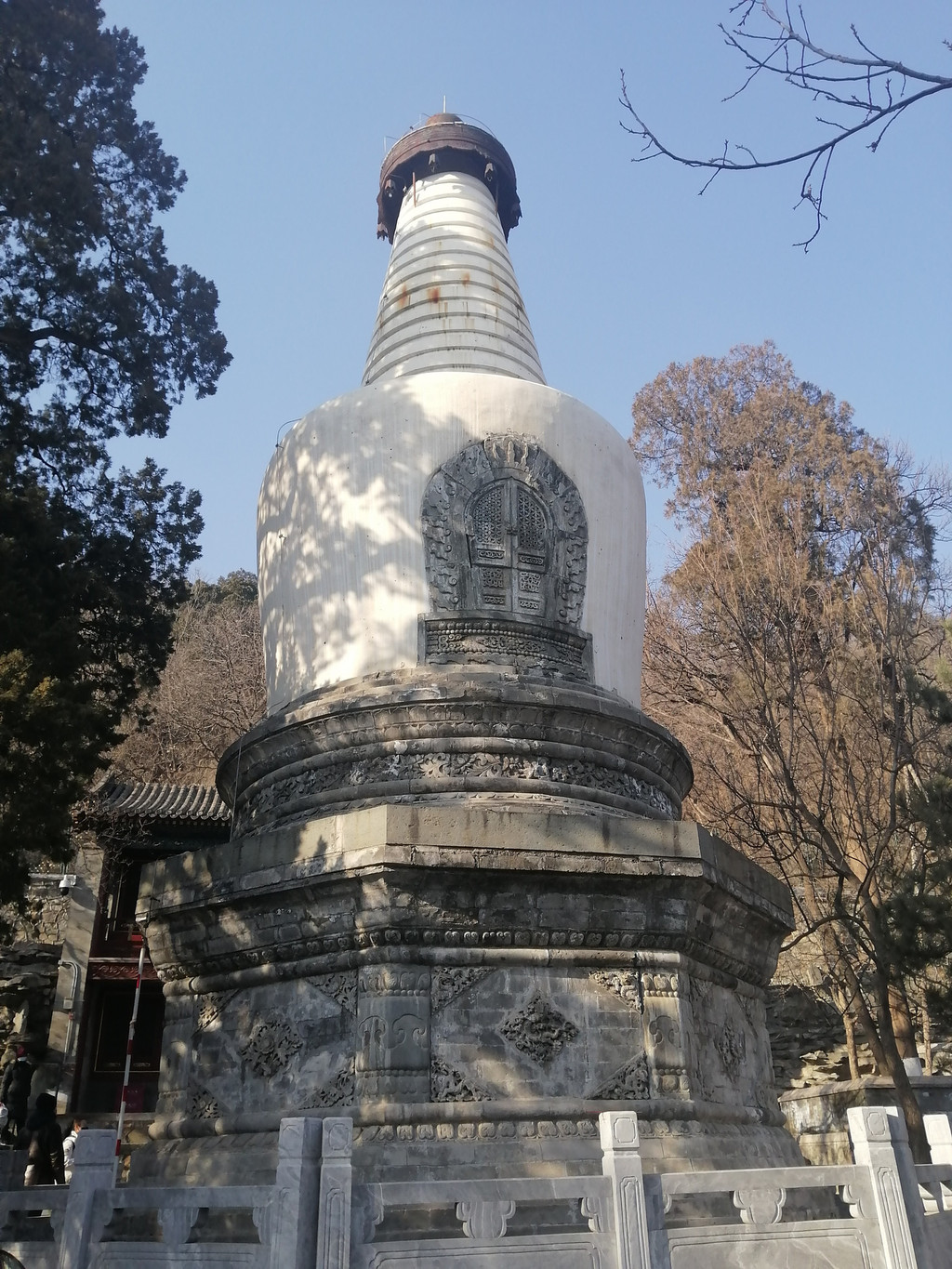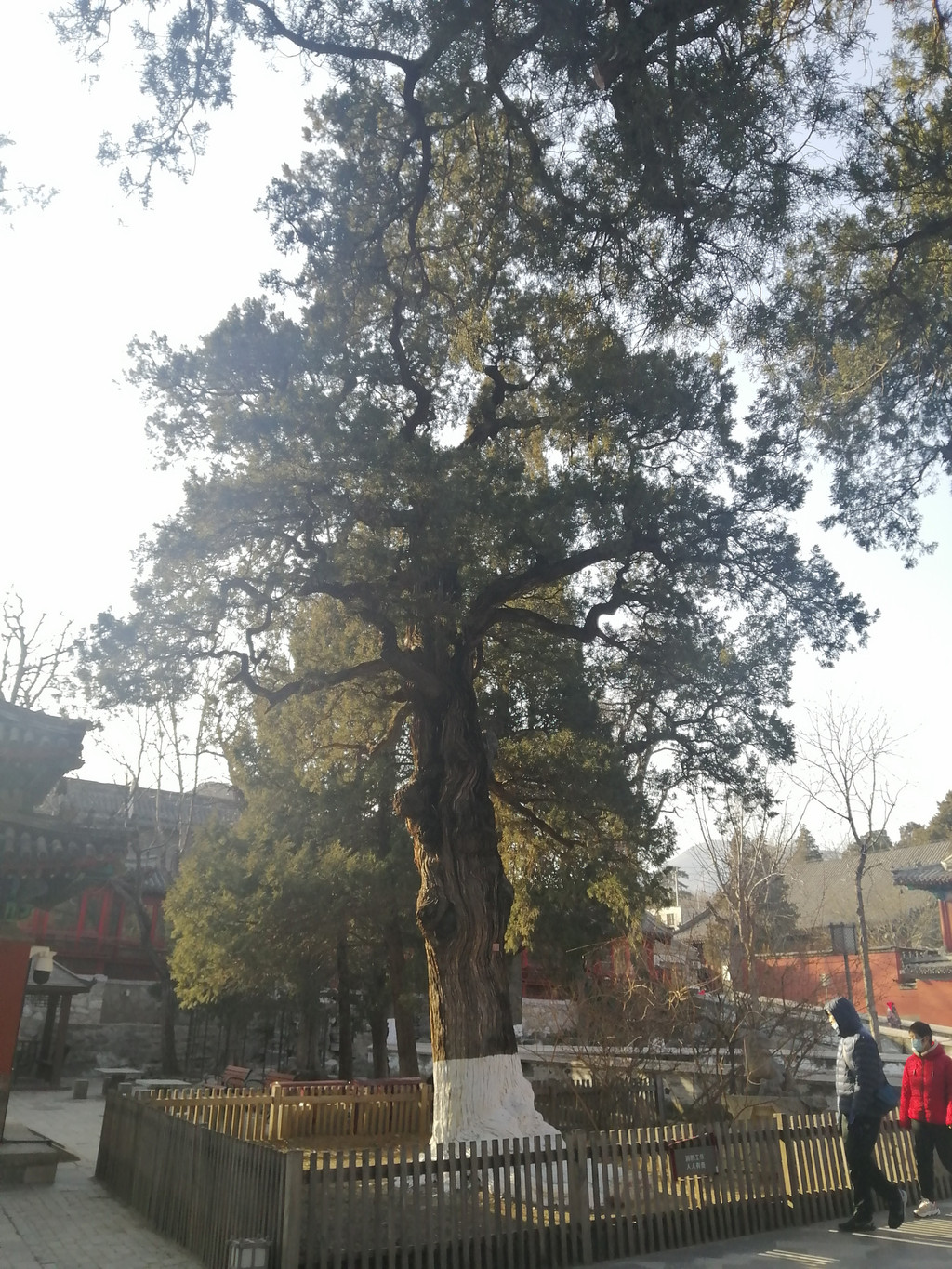 八绝“古松抱塔”:大悲坛后,立着一座白塔。塔为覆钵式,正面开着“眼光门”。塔顶的华盖上系有风铎。塔旁两株古老的油松虬(qiú)枝盘绕,将塔合抱其中。