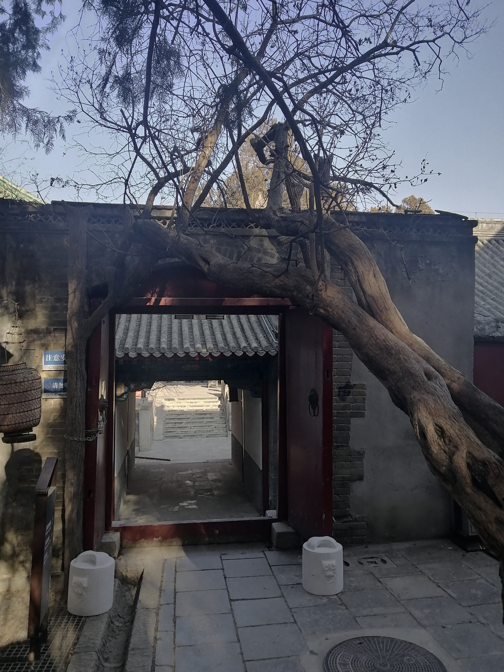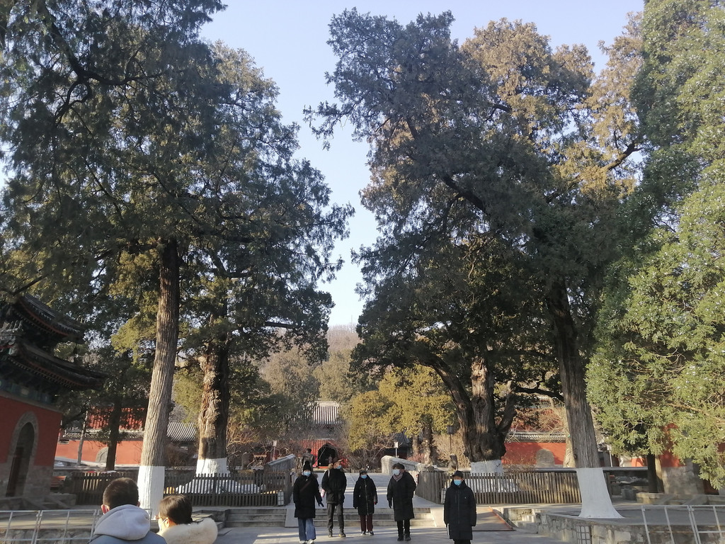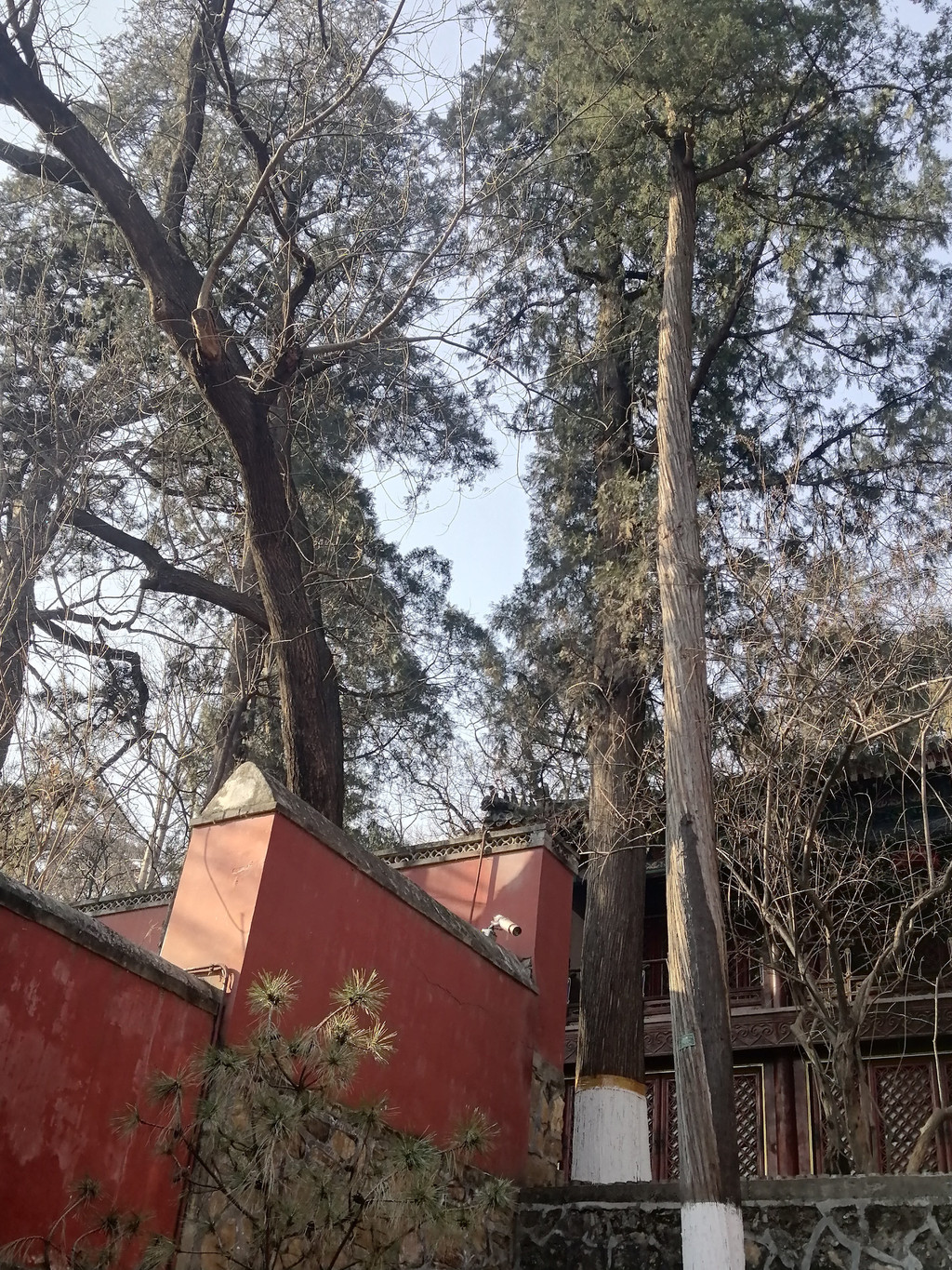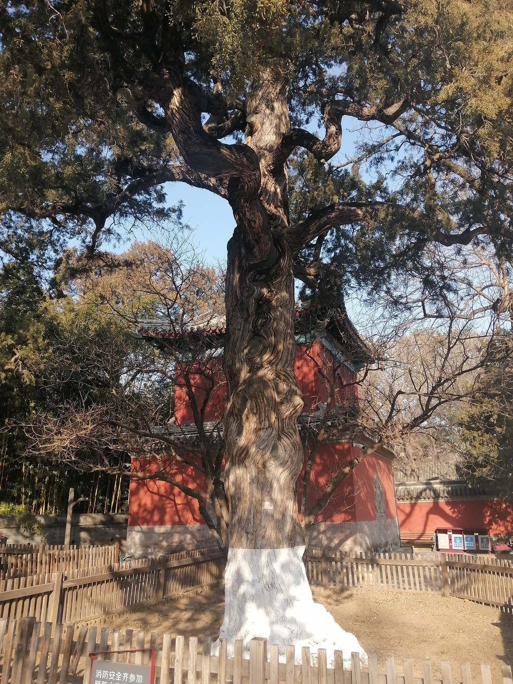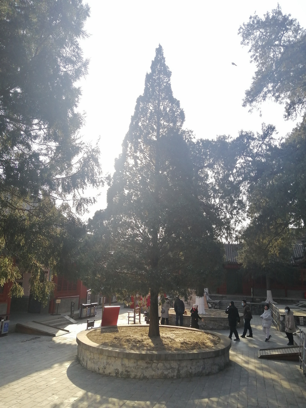 八绝“古松抱塔”:大悲坛后,立着一座白塔。塔为覆钵式,正面开着“眼光门”。塔顶的华盖上系有风铎。塔旁两株古老的油松虬(qiú)枝盘绕,将塔合抱其中。