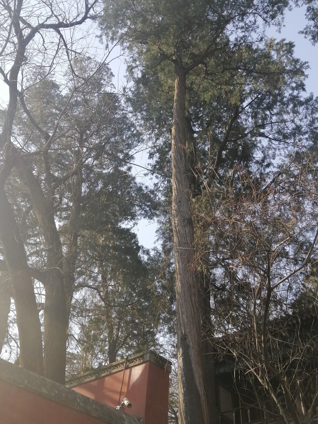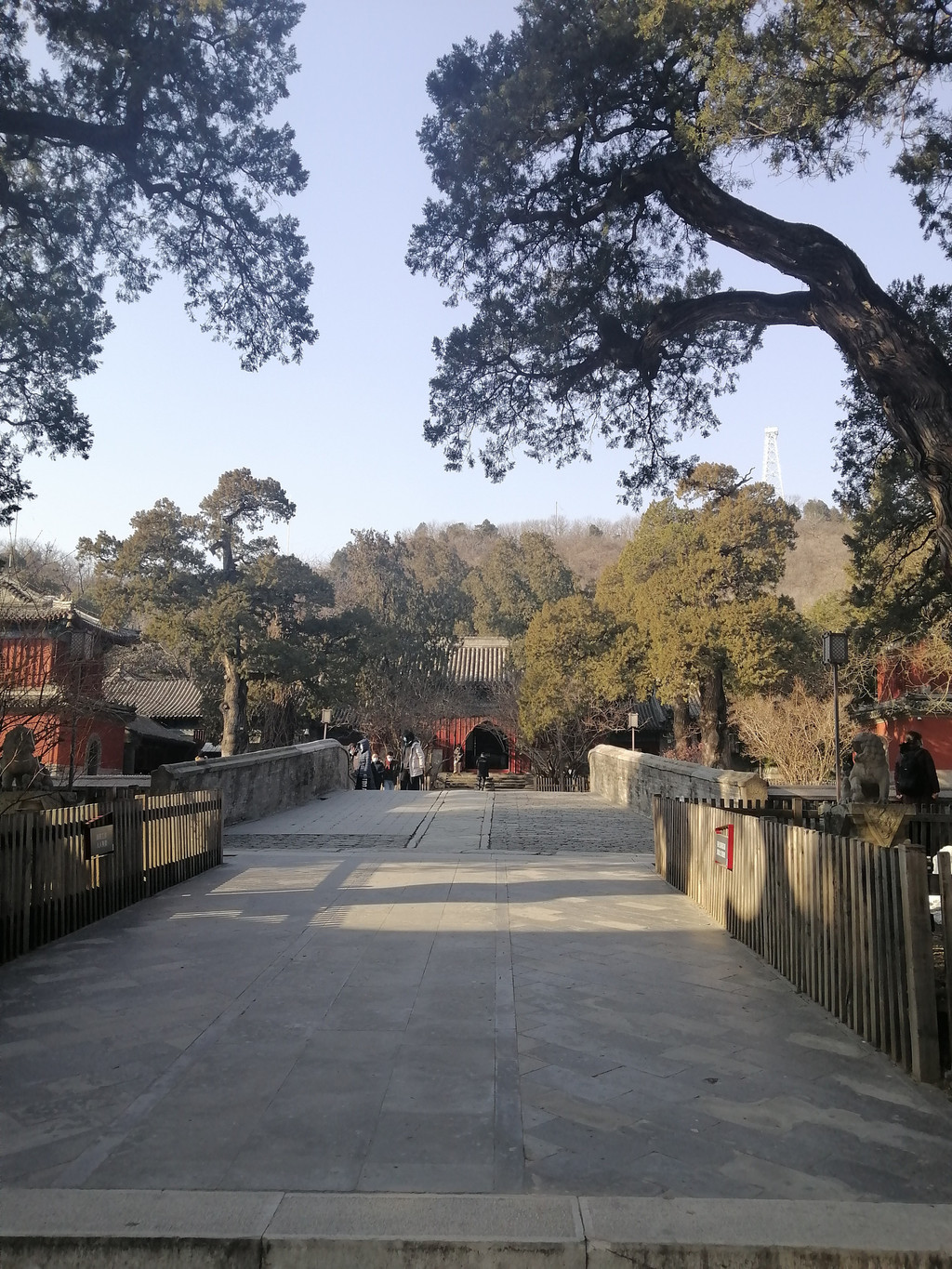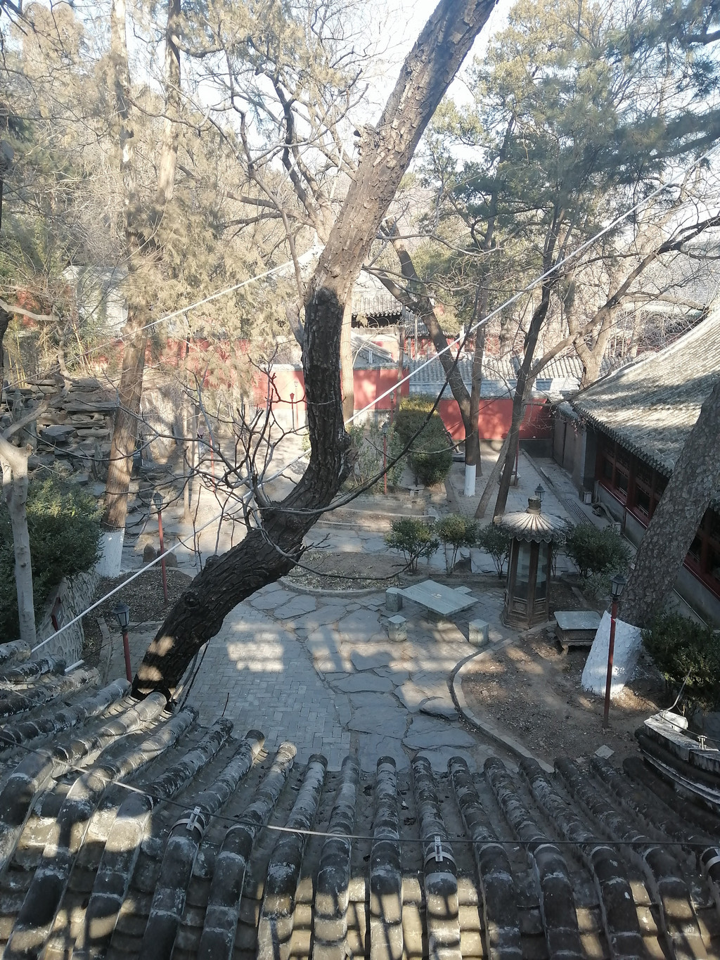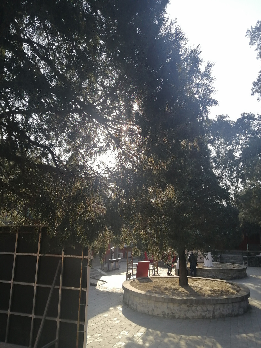 八绝“古松抱塔”:大悲坛后,立着一座白塔。塔为覆钵式,正面开着“眼光门”。塔顶的华盖上系有风铎。塔旁两株古老的油松虬(qiú)枝盘绕,将塔合抱其中。