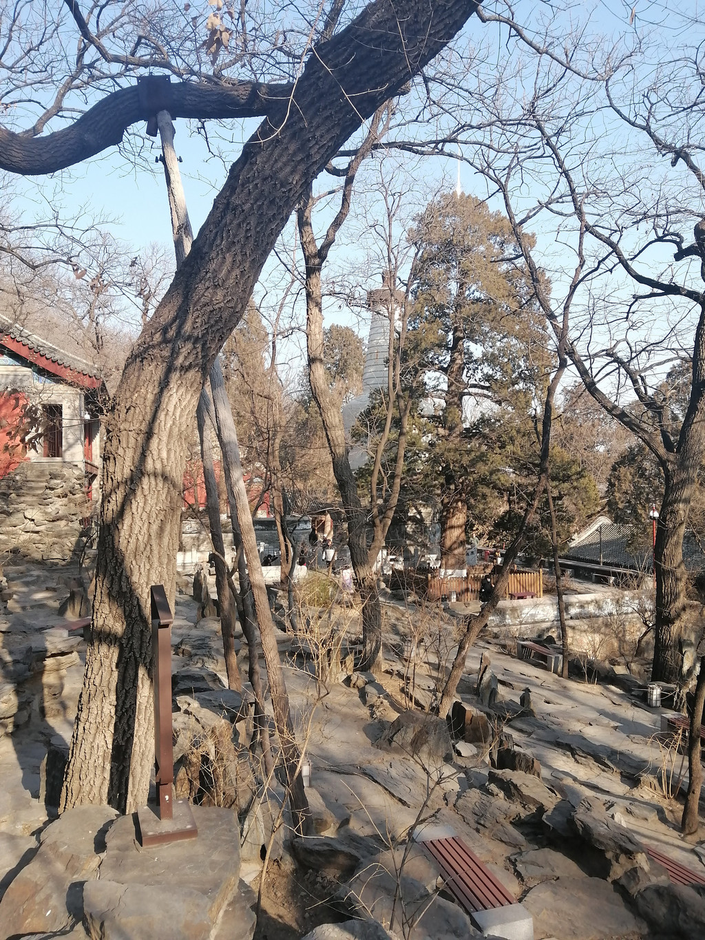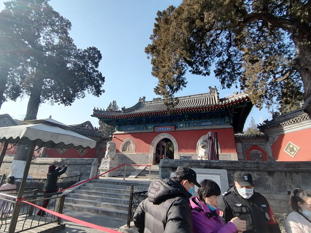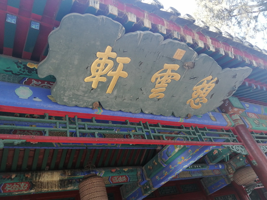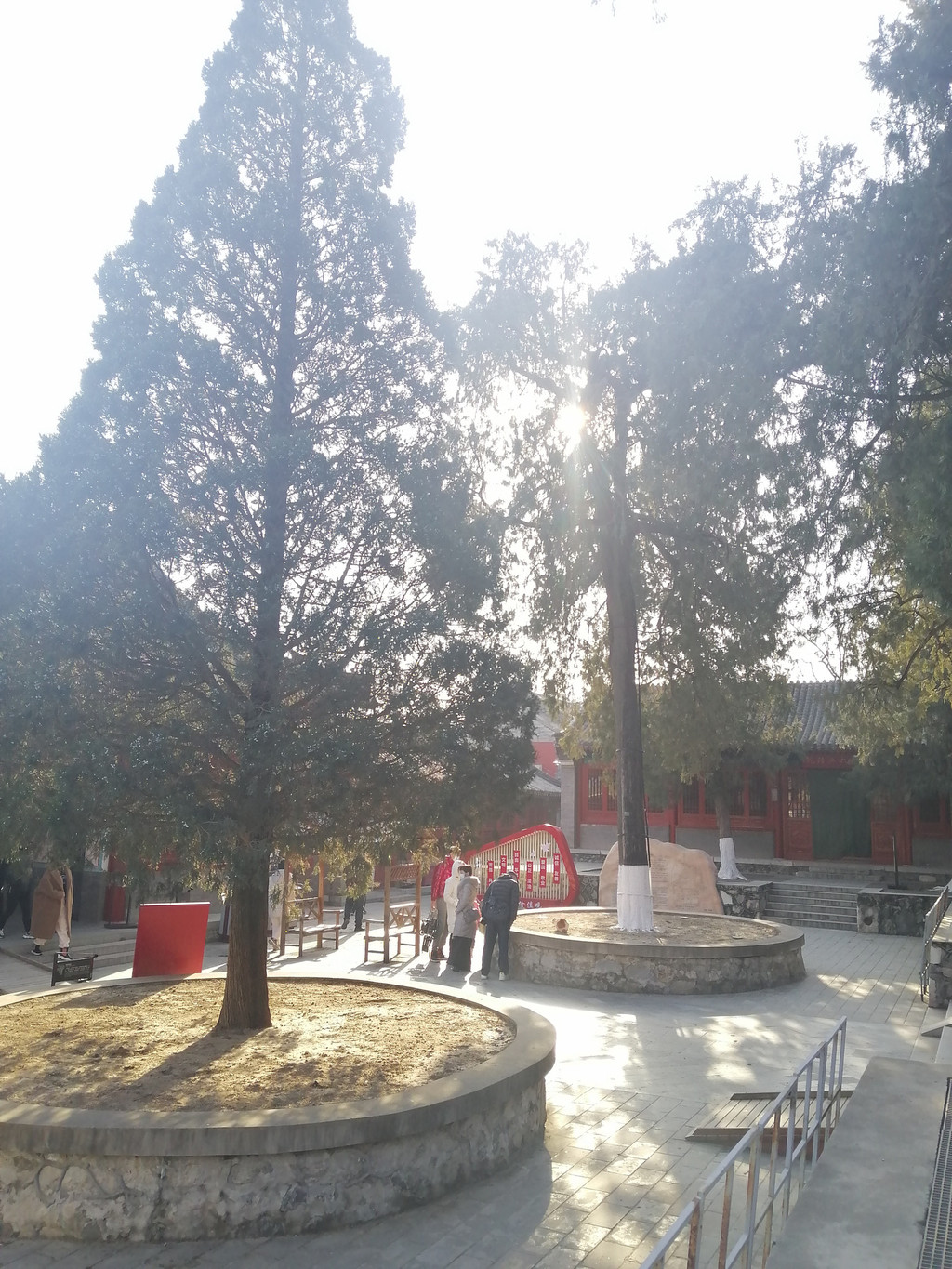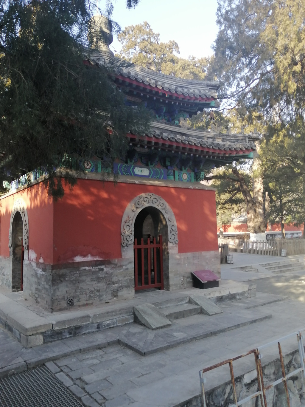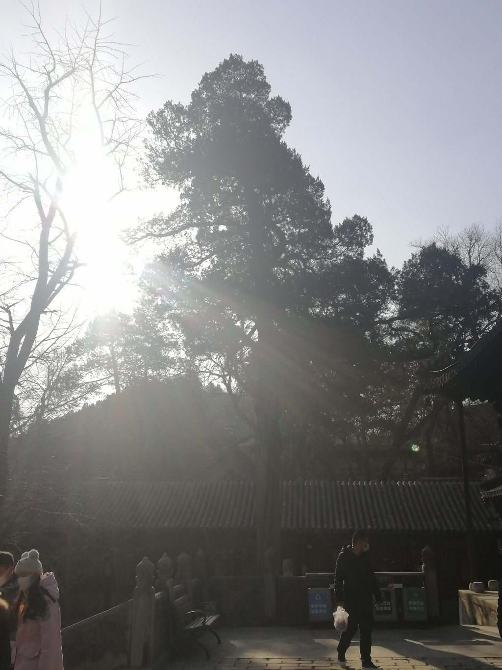 八绝“古松抱塔”:大悲坛后,立着一座白塔。塔为覆钵式,正面开着“眼光门”。塔顶的华盖上系有风铎。塔旁两株古老的油松虬(qiú)枝盘绕,将塔合抱其中。