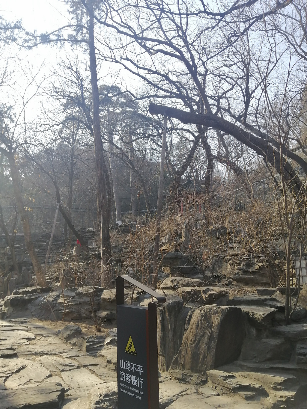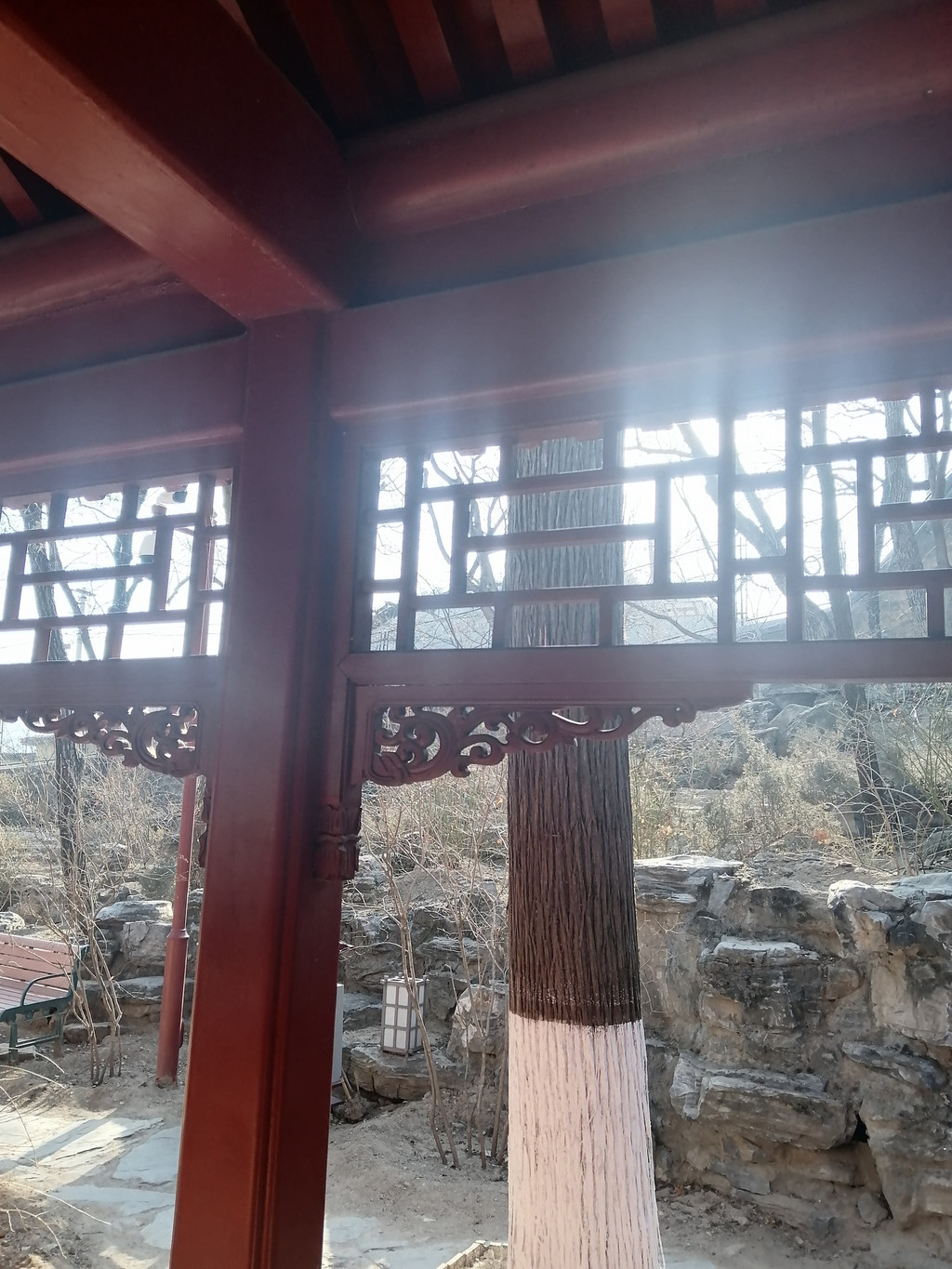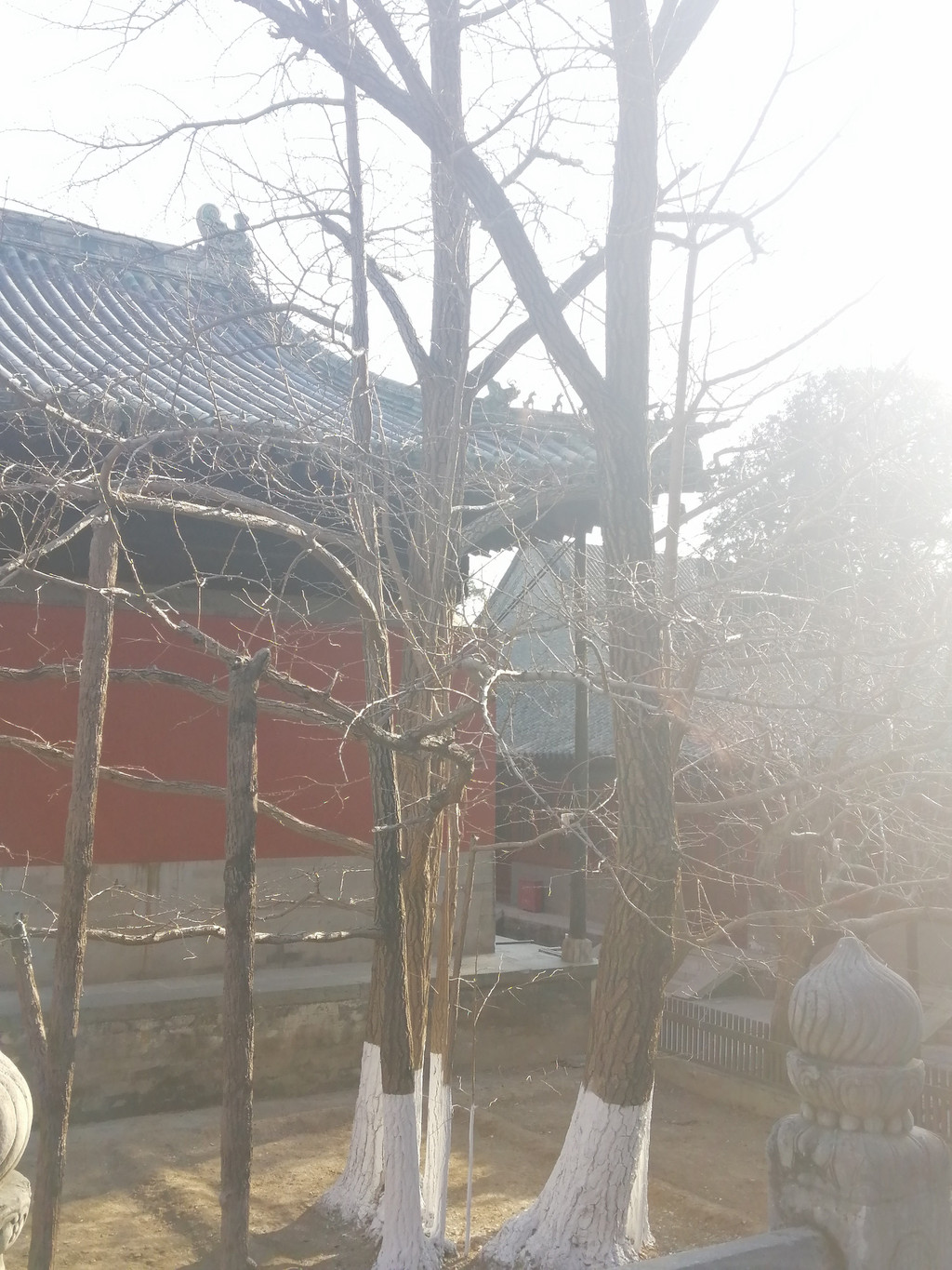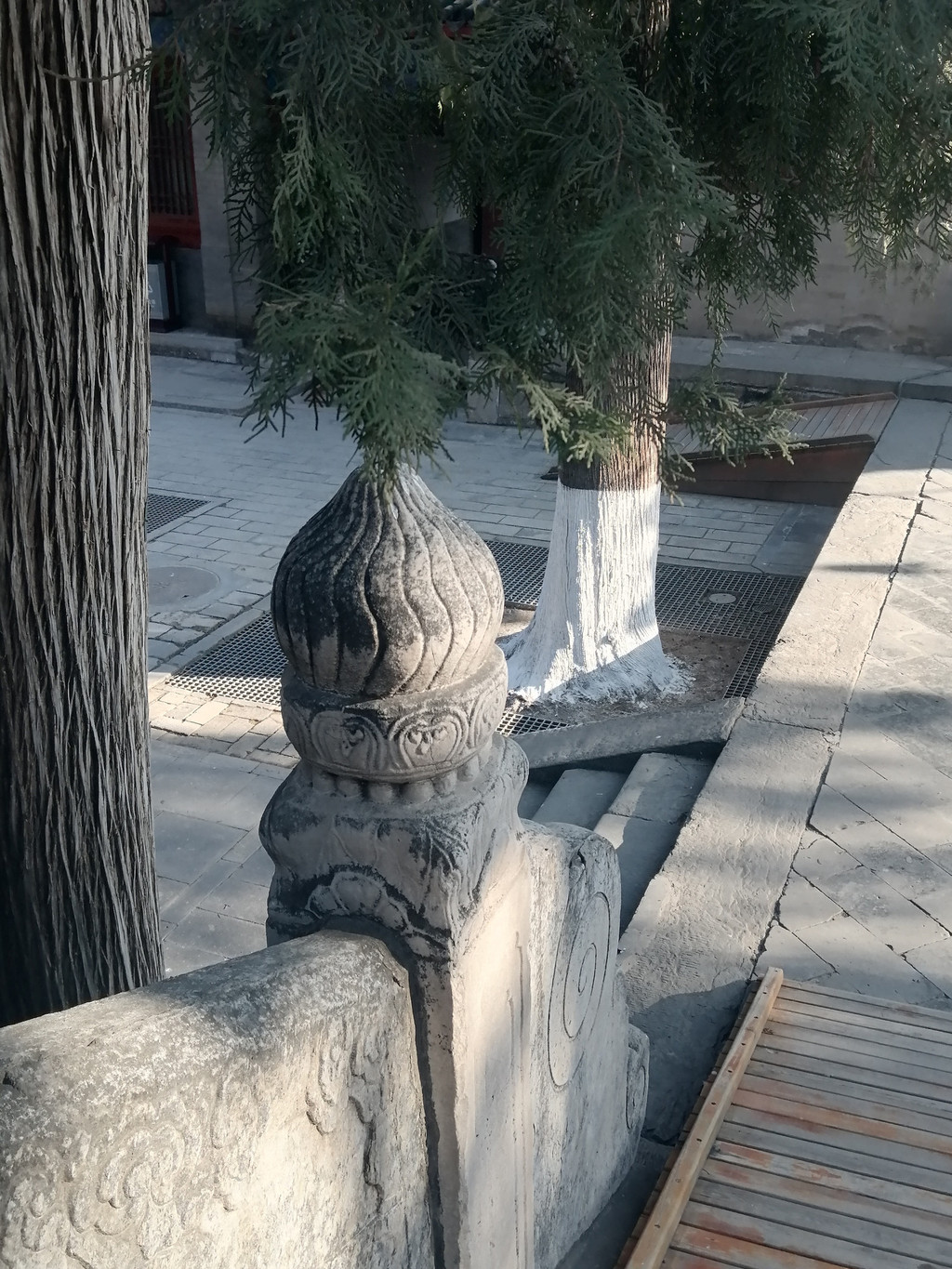 八绝“古松抱塔”:大悲坛后,立着一座白塔。塔为覆钵式,正面开着“眼光门”。塔顶的华盖上系有风铎。塔旁两株古老的油松虬(qiú)枝盘绕,将塔合抱其中。