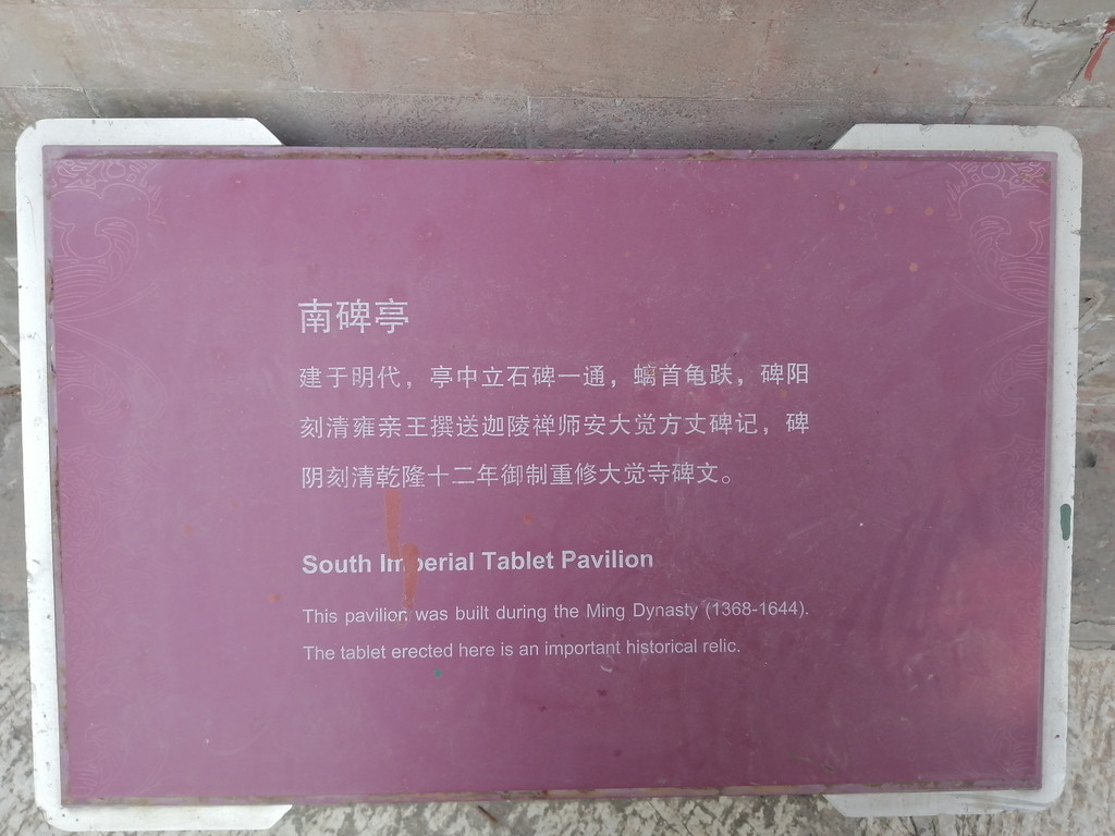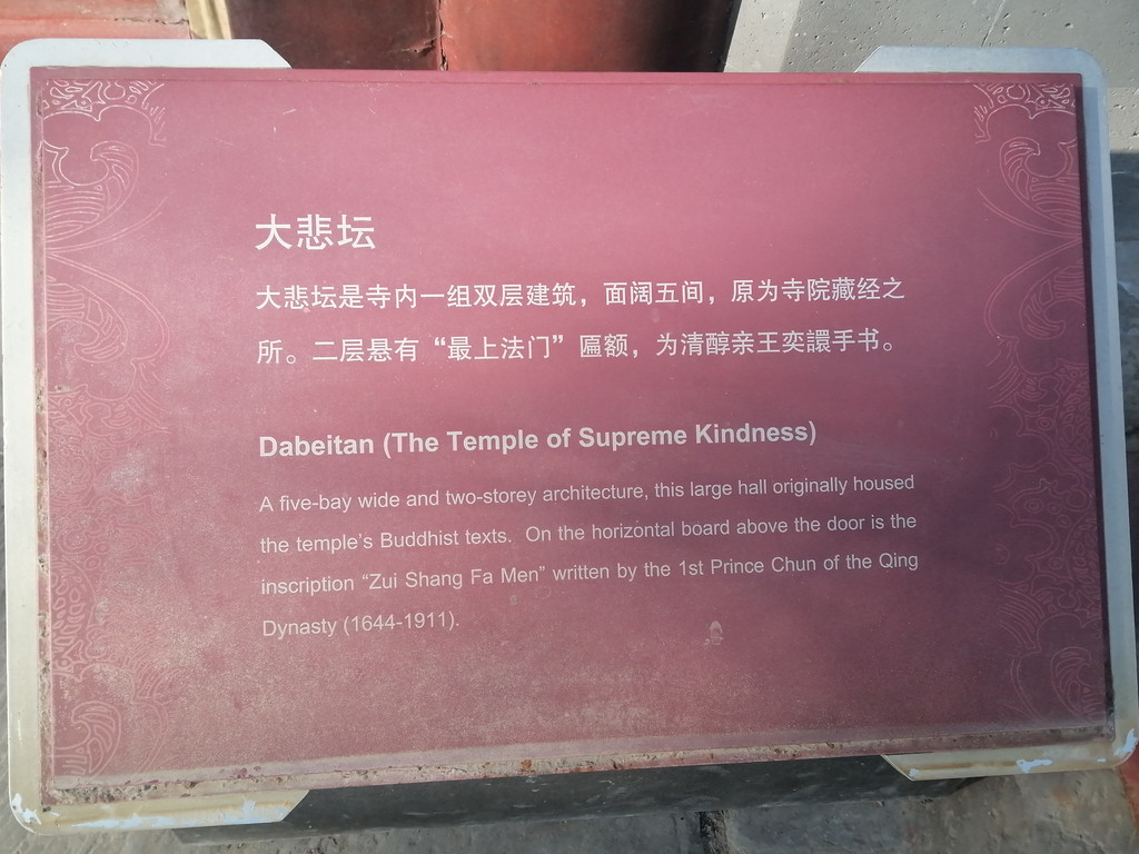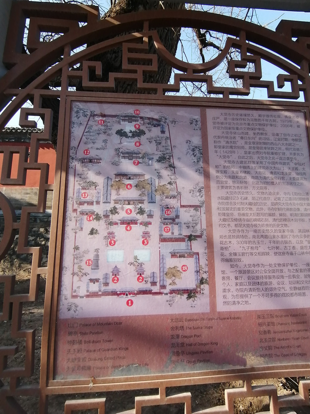 七绝“辽代古碑”:碑在大悲坛北,高一米多,顶部雕着盘龙,蜻首龟座,镌刻着《旸台山清水院藏经记》。碑中记载:辽咸雍四年(公元1068年)有一位叫邓从贵的善人舍钱三十万“葺诸僧舍”,又舍资五十万“印大藏经凡五百七十九轶”,龛措于寺中。这通古碑对于研究《辽史》以及辽南京(今北京)地理历史有重要价值。早在清乾隆四十三年(公元1778年),《金石萃编》的作者王昶(chǎng)“从寒芜落叶堆中搜得之,摩挲难诵,回环数四。因叹北方石刻,可证辽金史者甚伙。”碑中涉及北京十二个地名,都能在今天找到,如碑中的南京窠(kē),就是今天在寺东南的南安河。