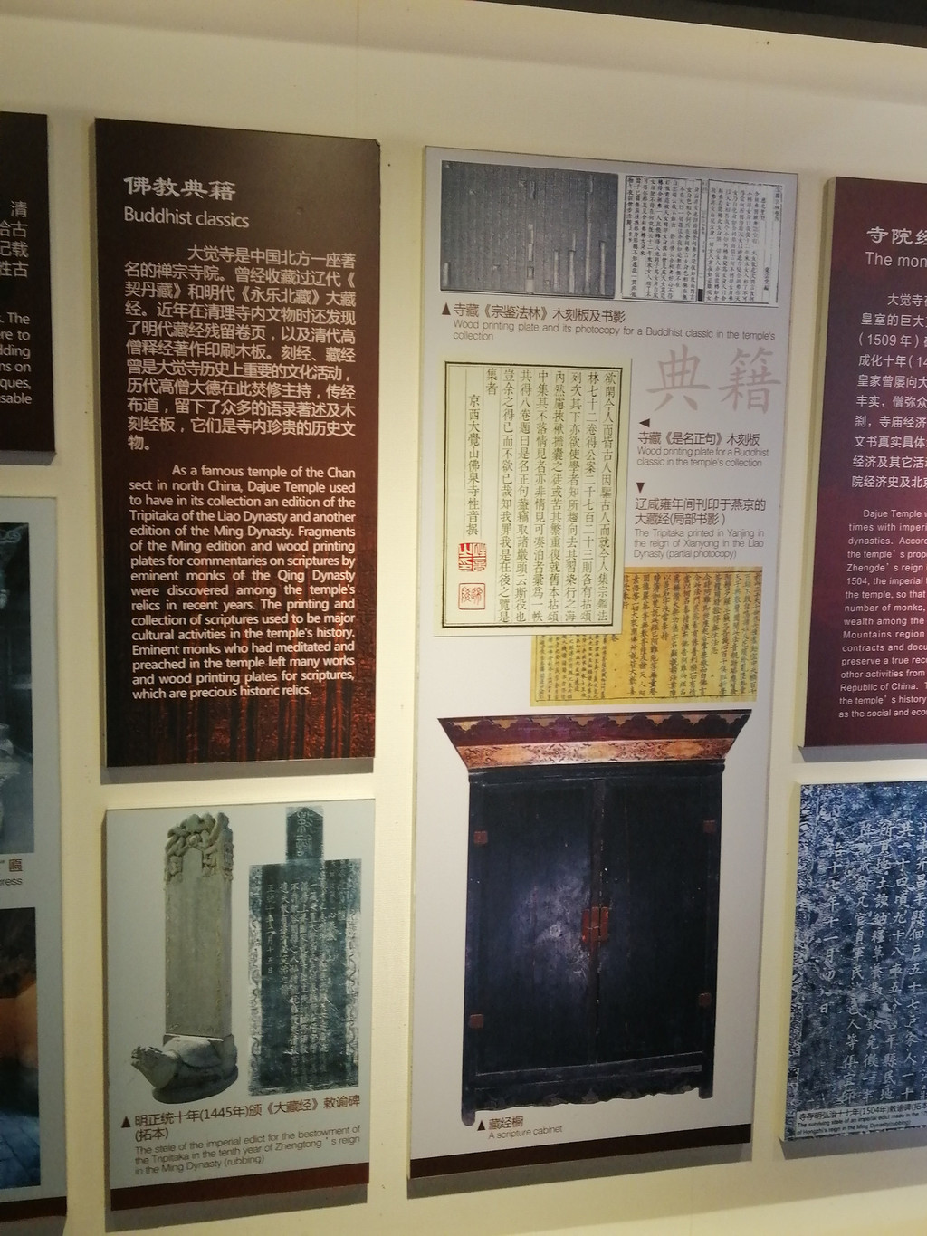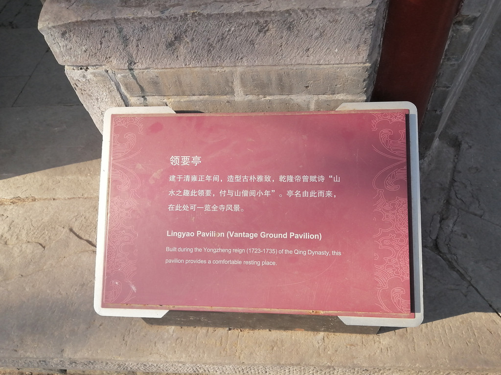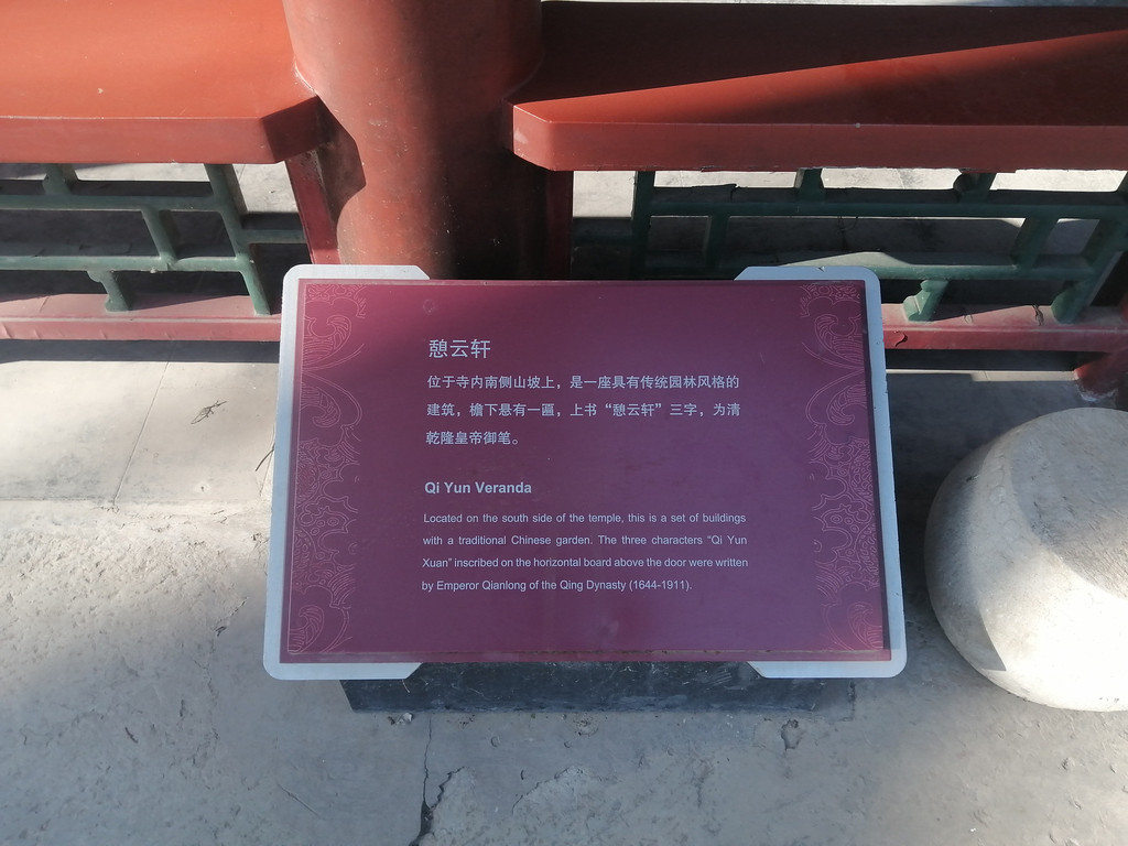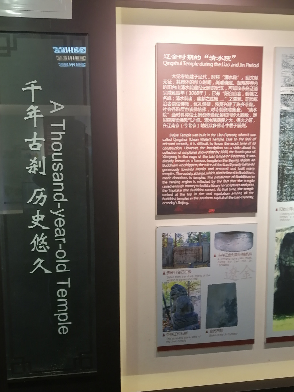 七绝“辽代古碑”:碑在大悲坛北,高一米多,顶部雕着盘龙,蜻首龟座,镌刻着《旸台山清水院藏经记》。碑中记载:辽咸雍四年(公元1068年)有一位叫邓从贵的善人舍钱三十万“葺诸僧舍”,又舍资五十万“印大藏经凡五百七十九轶”,龛措于寺中。这通古碑对于研究《辽史》以及辽南京(今北京)地理历史有重要价值。早在清乾隆四十三年(公元1778年),《金石萃编》的作者王昶(chǎng)“从寒芜落叶堆中搜得之,摩挲难诵,回环数四。因叹北方石刻,可证辽金史者甚伙。”碑中涉及北京十二个地名,都能在今天找到,如碑中的南京窠(kē),就是今天在寺东南的南安河。