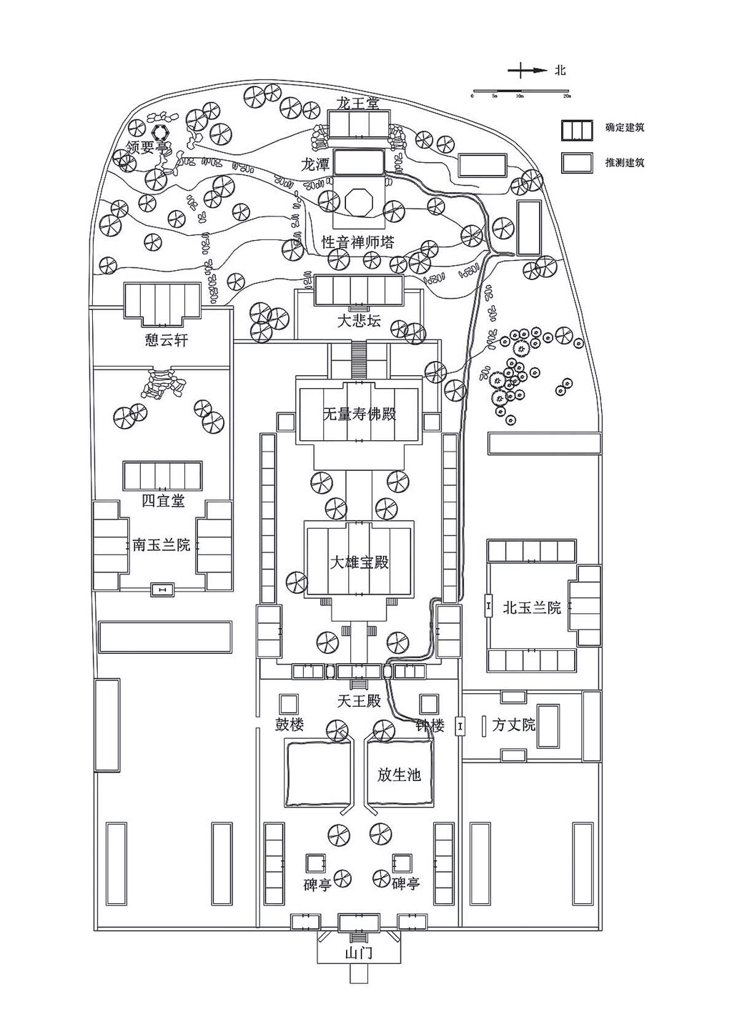 现存大觉寺主体为清隆年间重修后形成的。中路建筑及附属园林区域基本保留了清代格局,南北两路建筑则多有依现代功能需求的加建。清代寺院布局坐西向东,依山而建,有中、南、北三路建筑。