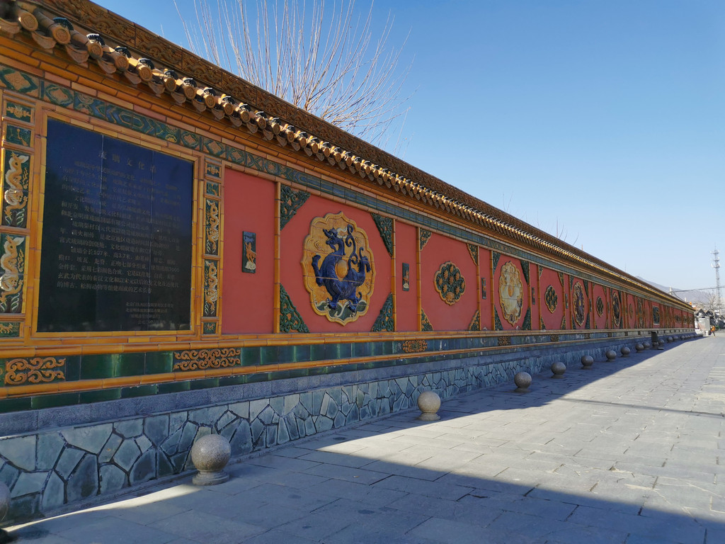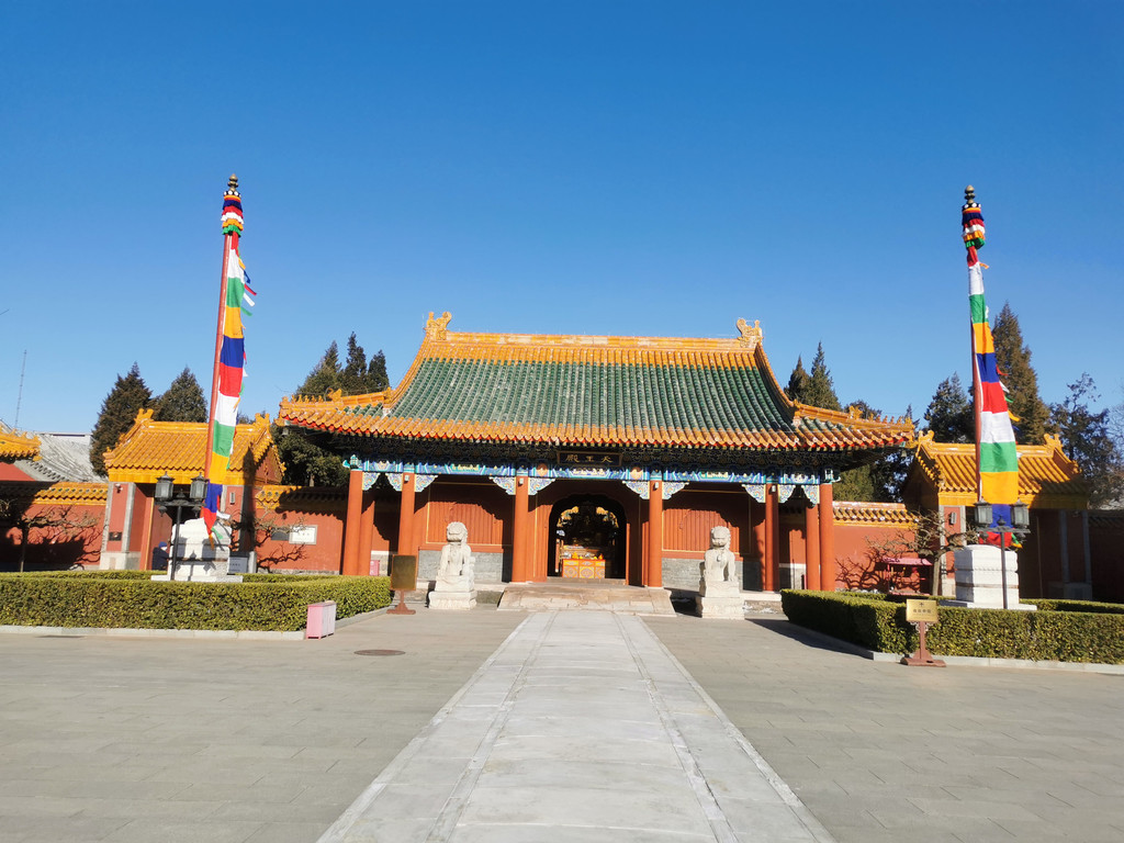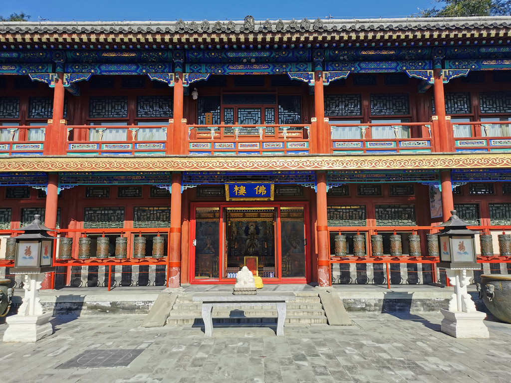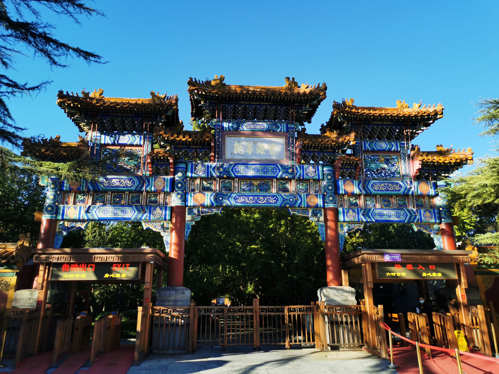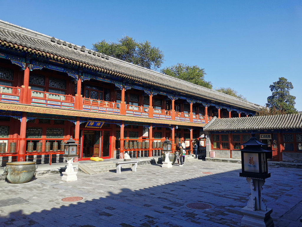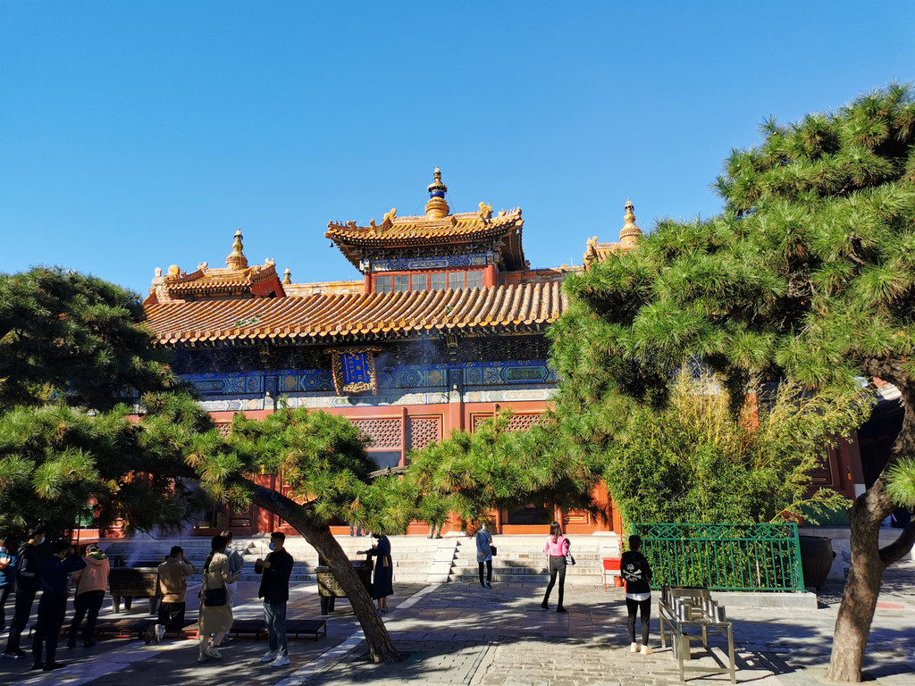 藏传佛教在京城的主要寺庙有雍和宫、西黄寺。雍和宫因为清朝雍正和乾隆两朝的缘故,建筑制式殿宇黄瓦红墙和皇宫紫禁城相仿等级,不是寻常王侯府邸富贵能够相比。乾隆年间雍和宫改为喇嘛庙,被作为清政府藏传佛教事物管理中心,而成为清朝中后期全国最高规格的佛教寺院。雍和宫进门是三进御笔亲题、高大巍峨的牌坊,无声中贵气逼人的皇家尊荣。穿过牌坊“寰海尊亲”和银杏长廊,依次往后昭泰门、八角碑亭、雍和门、雍和宫、法轮殿、万福阁等,宫、门匾额均满汉蒙藏四种文字书写。