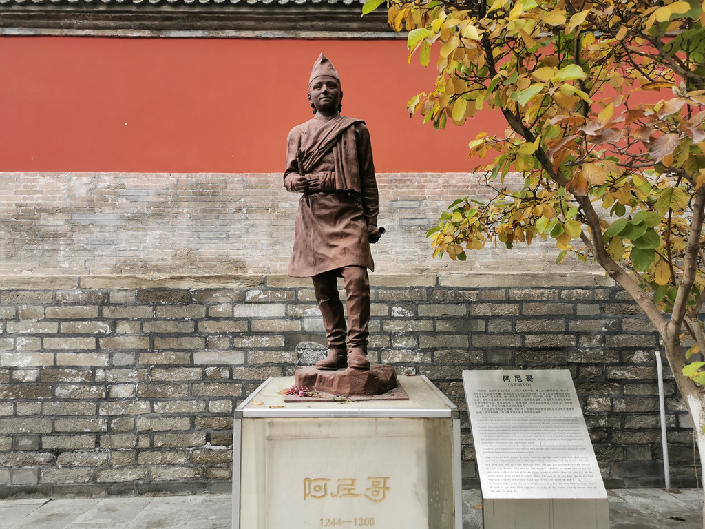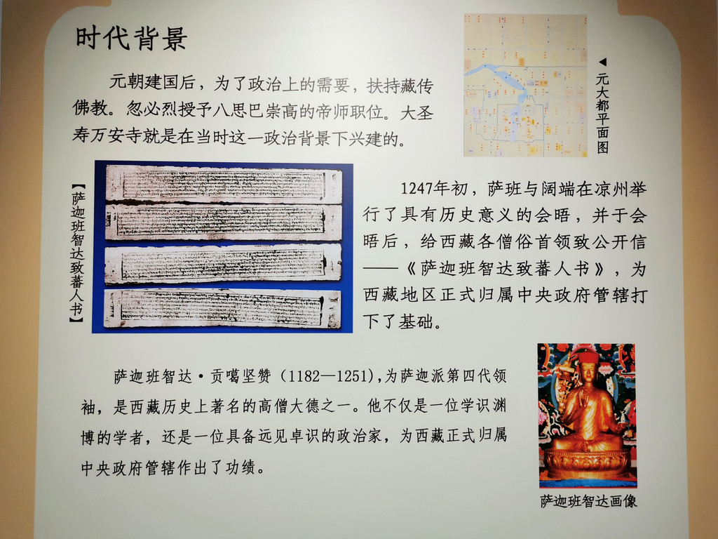 妙应寺,俗称白塔寺,元世祖忽必烈敕建。寺内有关于白塔寺缘起相关史料文物展,提及阔端、萨班凉州会盟以及八思巴和藏传佛教在元初的崇高地位。白塔由八思巴的徒弟-尼泊尔工匠阿尼哥主持建造、第二任国师亦怜真-也是八思巴的同父异母兄弟负责装藏,是北京地区最早的藏传佛教佛塔。白塔建成后塔下又建“大圣寿万安寺”,寺庙建成即成为元朝皇家寺院。寺庙殿宇曾毁于雷火,而白塔保存下来,后世重建庙宇,历史上白塔也多有重修。白塔寺建成至今700多年,历朝历代亦是几经兴衰。今天,白塔已经成为元大都遗存最重要的文化古迹。