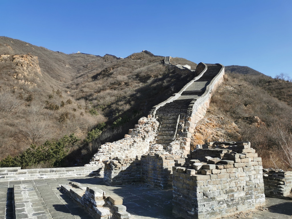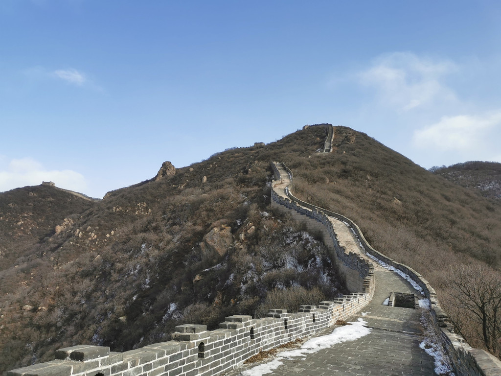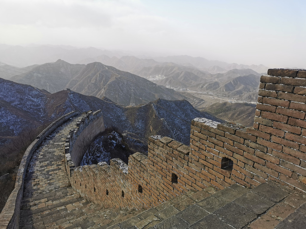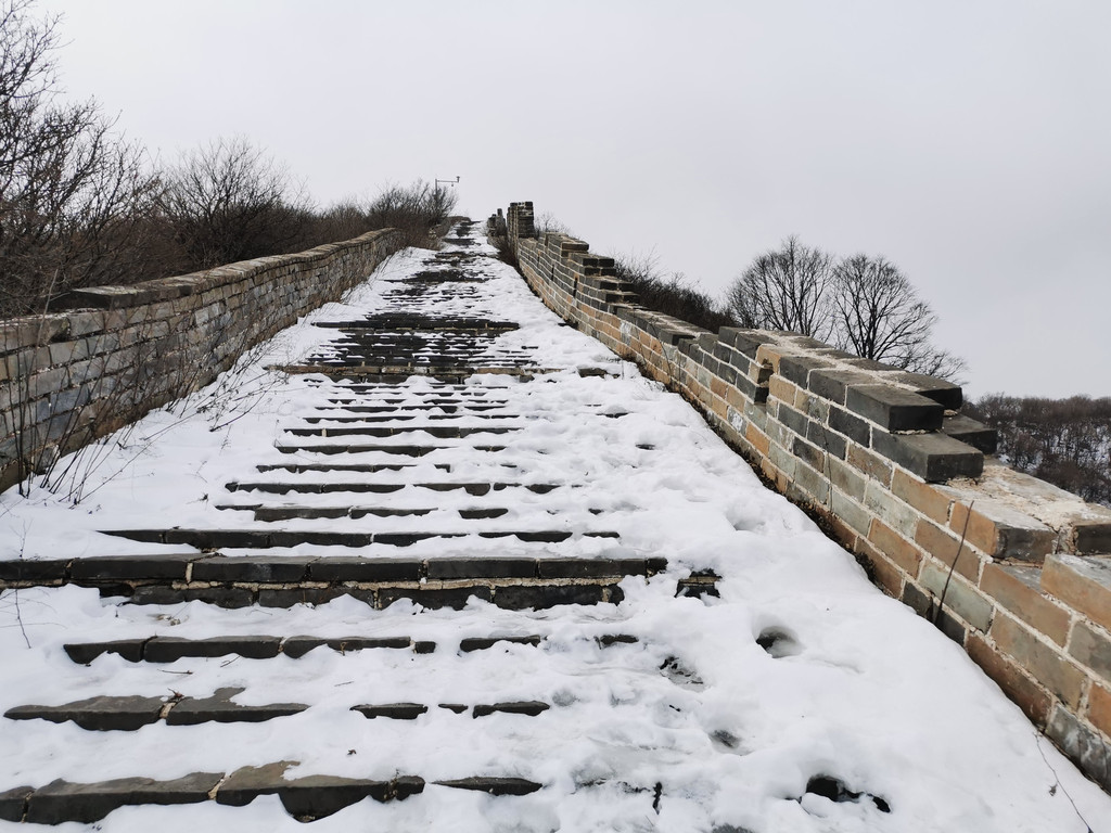 八达岭古长城即延庆残长城,走西线,沿着城垛一个个烽火台翻过去,最后从花家窑子段下去是石峡关、帮水峪村。山里积雪未化,部分长城段不仅积雪还有结冰,不少长城段是没有台阶的。不建议雨雪天走这一线--这天降温大风,特别是下行过了大半时,终于明白什么是寒风凛冽,庆幸已经快到山下了,风在下山以后-山谷里,人竟是站不稳…来时还是漫天灰蒙蒙厚厚的云层,待到下山北风去处竟已经是蓝天白云、晴空万里…