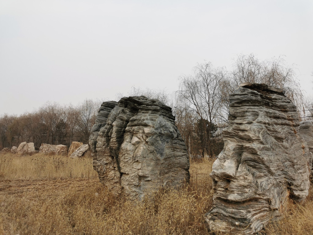 平谷奇石博物馆拆除了,只剩下好多兀大的巨石矗立在那边;一边有一位老先生在卖小东西—核桃、手串-像是檀木的等等,买了一对核桃30元—潘家园“核桃杨”要200、300、500一对不等。问了说可以到附近景满根石艺术馆看看;后来知道是景满-根石艺术馆,老板名叫景满--擅长根雕。转了一下看看,确实挺漂亮,价格小件一二千,大件上万,只是多经过打磨加工,圆润光滑却少了原石的那分朴拙与天然;一位大姐可和善客气,给我解说石的鉴赏--就是象形,还有做工等等。出来后去泃河看看,缘分还真不错,有几块金海石颇有画面意象。
