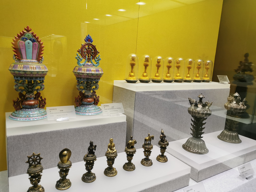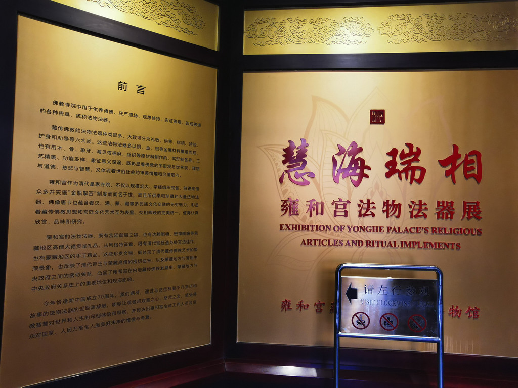 慧海瑞相法物器物展,也充分反映了雍和宫作为皇家寺院,在藏传佛教发展、内地与蒙藏关系发展上的重要历史地位。乾隆皇帝作为国家最高统治者处理蒙藏宗教事务的政治智慧还有“金瓶掣签”制度的确立:由乾隆亲自设计督造、清宫制定的两个金奔巴瓶一个送往拉萨大昭寺、一个就留在雍和宫,用于掣签确立活佛转世;相关历史掌故可参见雍和宫官网“雍和史话”,而我知道金奔巴瓶依稀应该是在梁羽生先生的武侠小说“冰川天女传”…