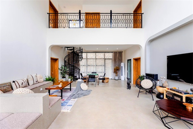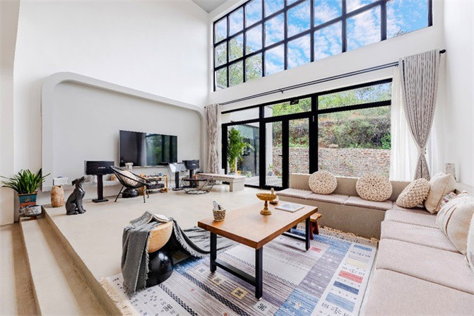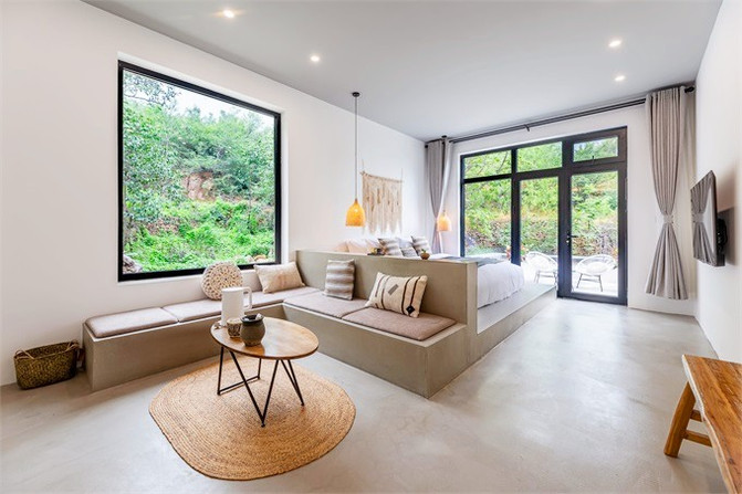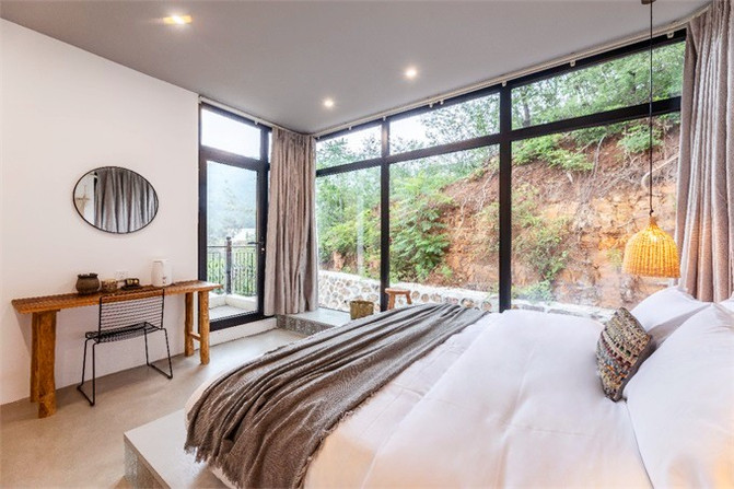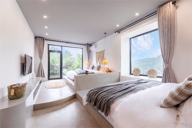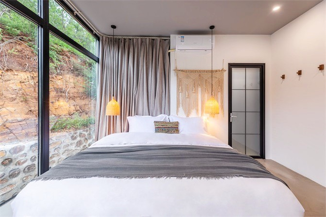 民宿颜值满分,两种灯光颜色可以选择,灰白冷色调,暖暖的原木色,都演绎着现代轻奢气质,房内轻奢,房外野奢。客房注重美感,舒适性和实用性,空间十分宽敞,且拥有宽阔落地窗。