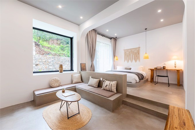 民宿客房:室内设计精致淡雅,原色的家具搭配纯白色的织物,创意环保,清新简约,房间内有沙发,茶几,房间内充斥着浪漫的色彩,仿佛心灵穿越了山林。