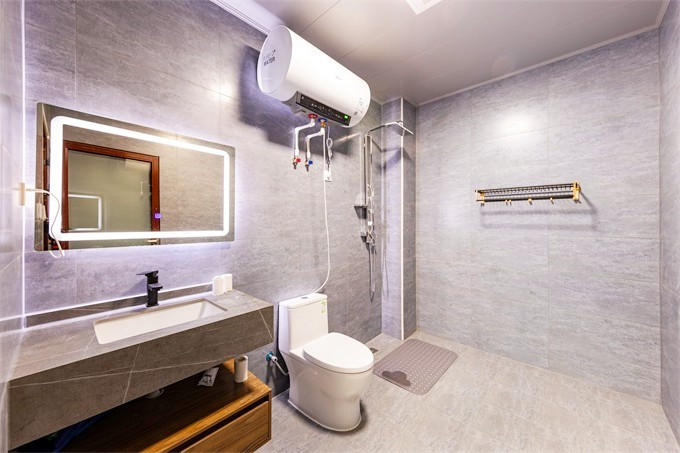 浴室墙壁为浅灰色瓷砖,浴室还做了干湿分离,更加方便,也更干净卫生。洗手池、毛巾烘干机、洗衣机和烘干机应有尽有,整齐排列在这个小小空间里。