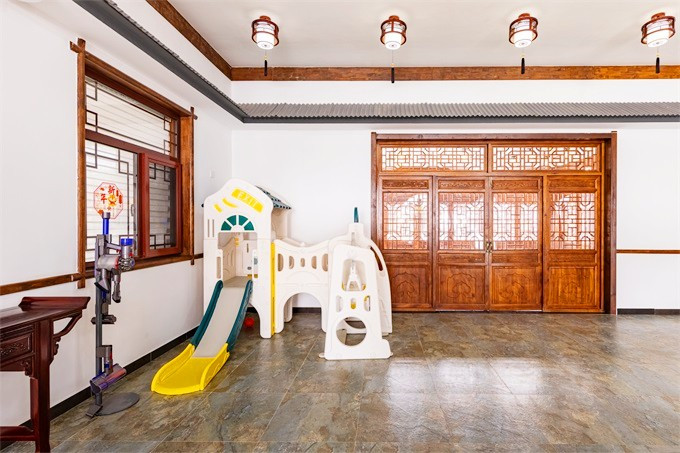 民宿餐厅可以容纳10-15人就餐,适合小部门团建、出游,简约、木质的室内风格,看一眼就会爱上,房间内还摆放着滑梯,可以提供小朋友玩耍。