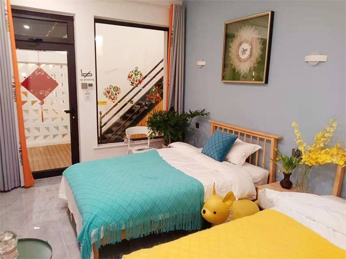 露台远眺便是群山环绕,院内儿景观也是主打干净简洁,但是花花草草的点缀,也是让人眼前一亮。整个民宿气息淳朴优雅,还有很多的装饰,墙面实际颜色是白的,但是出图片效果非常好。