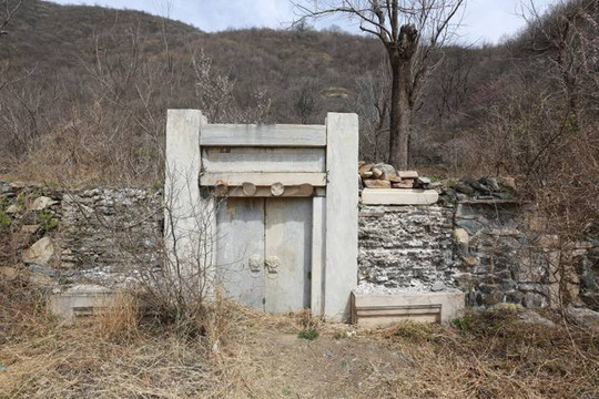 张公墓墓门匾额上书"内府供用库掌印张公寿域",四个门簪从前皆刻有花纹,现已经被凿。门环为一对兽头的浮雕,仍栩栩如生。