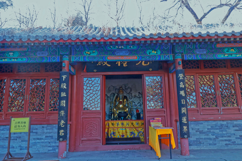 殿内的天花板为金漆彩绘,殿顶正中部分是一个"斗八藻井"。藻井上层的圆形部分正中的穹顶上倒挂着一条木雕团龙,龙头居于藻井中心,俯视下方。团龙四周的穹壁上还雕有八条"升龙",合为"九龙护顶"。