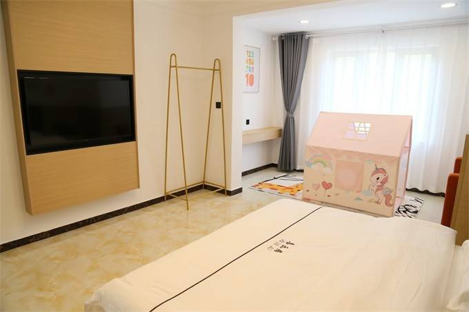 亲子套房一间,空间布局还是十分合理,拉开窗帘便真的可以看见一整面绿色,真的特别舒服!房间内的洗浴采用的是干湿分离,房间里纯白的风格每个角落都很出片。
