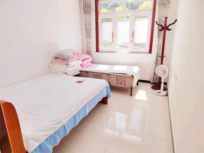 一厅五室容纳10人住宿,一厅两室容纳6人住宿,大炕和亲子上下床容纳5人住宿,每间客房的面积很大,视野都不错,打开窗户,微风吹过很是舒爽,农家院三面都是群山密林,在这里吹着微风,听着鸟鸣,也能悠然自在地度过一整天。床的位置正对着大大的落地窗,真的是躺在床上就能将风景尽收眼底。