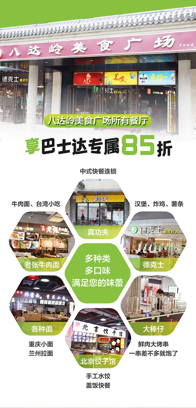 6) 巴士达客户专属折扣,八达岭美食城所有餐厅85折钜惠