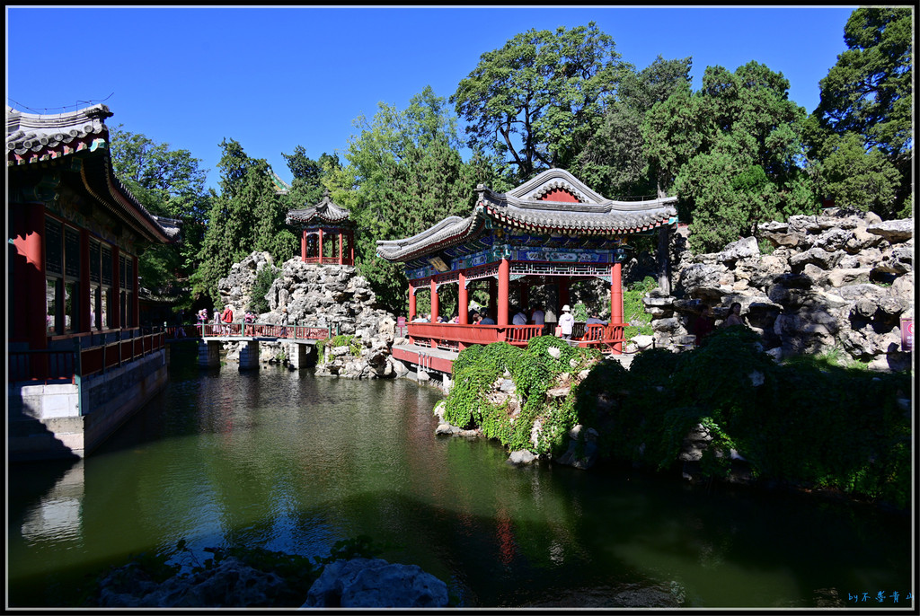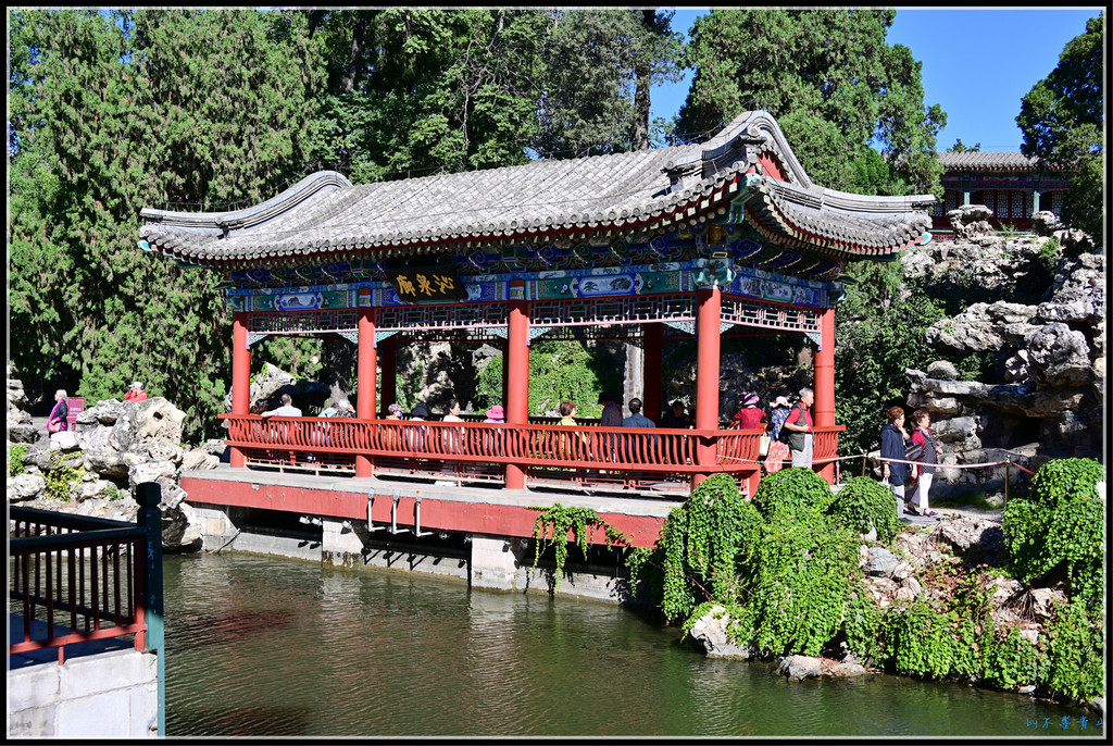 过镜清斋,众多太湖石及各种别致精巧的建筑包围着的一弯水系。