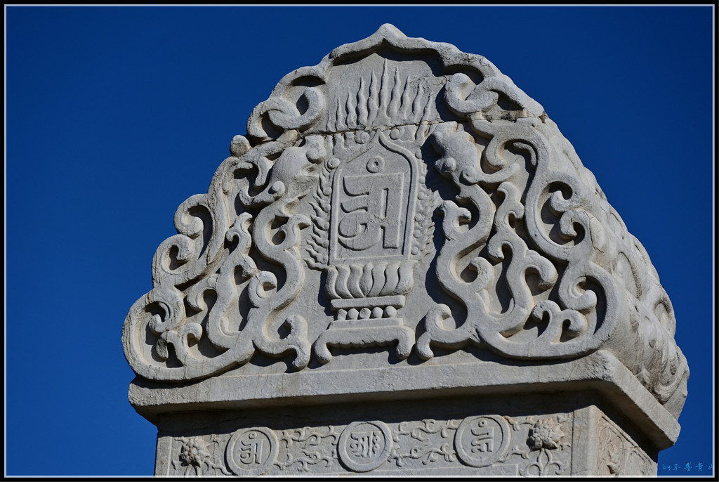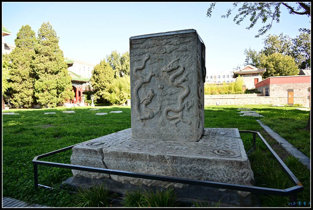 碑首为四龙衔方形宝顶,四面卷刹雕行龙。